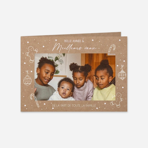 Vous souhaitez partager de jolis souvenirs de votre année à vos proches ? Prenez le temps de créer une carte de voeux à votre image, en y glissant vos plus belles photos de l’année. Personnalisez vos cartes de vœux de Noël et de bonne année avec des photos de vos enfants, de vos amis ou de votre famille au complet. Laissez libre cours à votre imagination : photo avec le sapin de Noël, en pulls d’hiver ou devant la cheminée, tout est possible pour créer une carte de vœux originale. Si vous recherchez un modèle avec photo qui marque les esprits, une carte de vœux marque-page sera idéale. Un format original et pratique qui permettra à vos destinataires de conserver toute l’année un joli tirage style photomaton de vos plus belles photos de famille. Agrémentez nos modèles de cartes de vœux avec photo de vos plus beaux clichés et surprenez vos destinataires avec des courriers entièrement personnalisés. Vous pourrez ensuite inscrire votre message de meilleurs vœux dans la typographie, la taille et la couleur de votre choix grâce à notre outil d'édition. De la création de nos designs jusqu'à l'impression haut de gamme de vos cartes, nous avons à cœur de soigner tous les détails afin de vous apporter entière satisfaction dans votre commande.