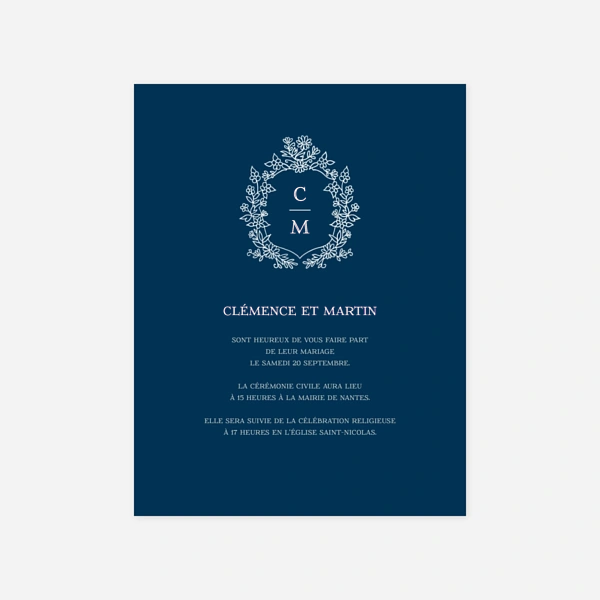 Pour créer un faire-part raffiné et léger, rehausser un faire-part de mariage blanc avec des motifs, des illustrations ou un aplat de couleur bleu est un choix approprié. Vous retrouverez ce mélange harmonieux et élégant sur nos différentes créations, notamment sur nos modèles marins imaginés pour une union au bord de l'eau. Créés pour s’adapter au plus grand nombre, nos modèles sont pour la plupart disponibles en plusieurs formats (recto verso, 4 pages, fenêtre ou marque-page) et sont entièrement personnalisables. Grâce à notre outil d’édition, vous pourrez ajouter vos photos, écrire votre message d’invitation avec les typographies de votre choix, et jouer avec les différentes possibilités de mise en page. Nous vous laissons choisir le papier sur lequel seront imprimés vos faire-part de mariage bleu et blanc et la teinte des enveloppes qui les accompagneront.