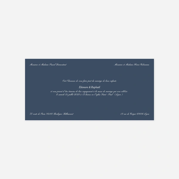 Vous cherchez la valeur sûre, l’élégance et l’harmonie… nos faire-part de mariage bleu et blanc sont faits pour vous ! Le bleu renvoie généralement au ciel et à la mer et représente aussi la fidélité, la confiance et la vérité. Le blanc, quant à lui, est synonyme de sagesse et de pureté. Si l’association de ces deux couleurs évoque le classicisme, notamment avec des tons foncés comme le bleu marine, elle pourra tout aussi bien trouver une forme de modernité avec du bleu roi ou des tons plus clairs comme le bleu turquoise ou le bleu pastel. La neutralité du blanc s’accordera parfaitement aux nuances de nos faire-part mariage bleus. Elle pourra se retrouver par petite touche sur un fond bleu, pourra faire ressortir un texte foncé, ou accompagnera un joli camaïeu de bleu… Pour une union en bord de mer, champêtre, estivale ou tout simplement traditionnelle, vous trouverez, on l’espère, le modèle qui vous conviendra. Le design de nos faire-part de mariage bleu et blanc se décline généralement sur le carton d’invitation, le menu, les marque-places et même jusqu’aux remerciements de chaque gamme. Vous pourrez ainsi harmoniser facilement votre papeterie autour du thème de votre mariage.