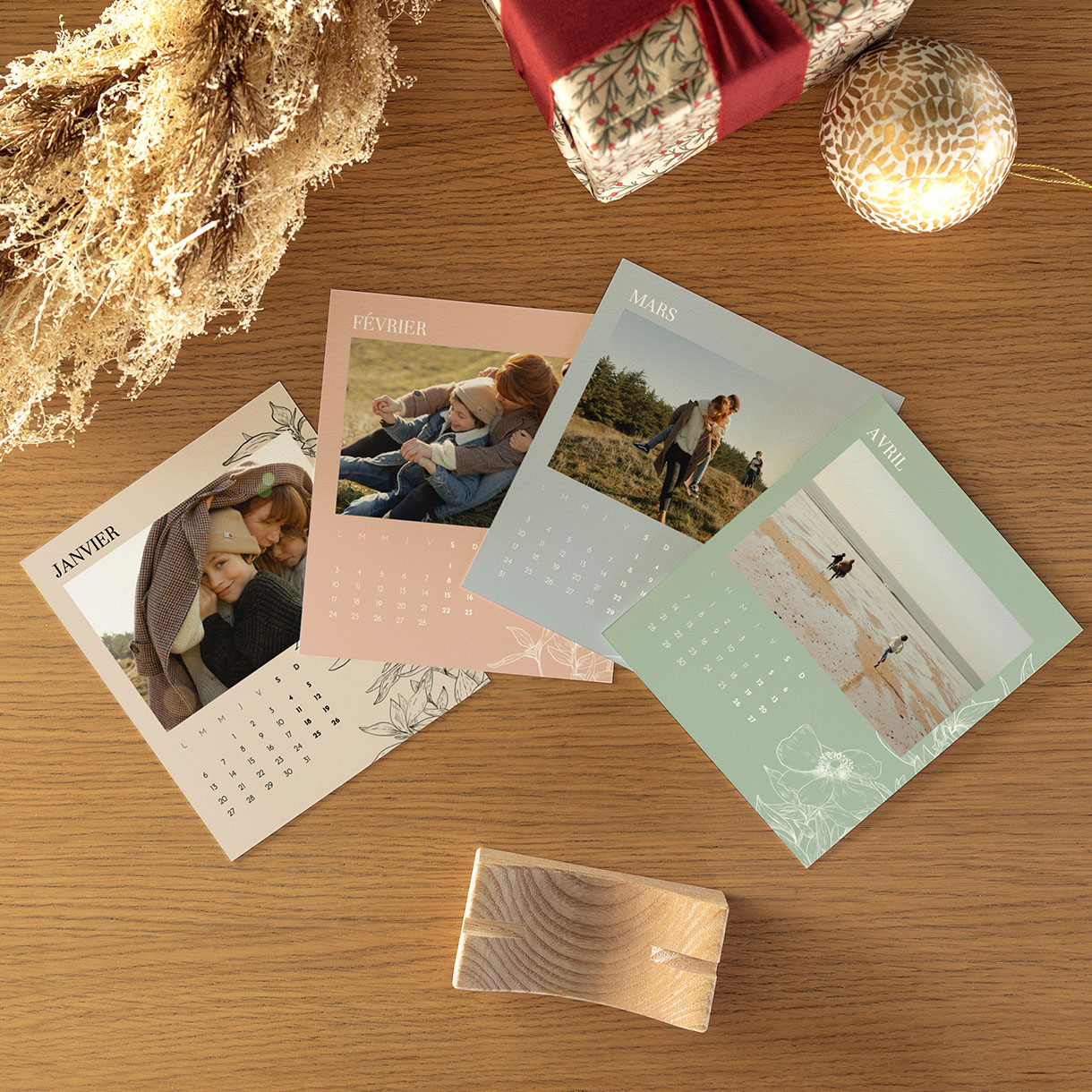 Ce tout nouveau modèle de calendrier a été imaginé par nos équipes comme un véritable objet de décoration. Son socle en bois de frêne français, dessiné par nos designers sera le support parfait pour mettre en valeur les 12 cartes de votre calendrier. Vous avez le choix entre 4 templates graphiques ou illustrés sur lesquels vous pourrez imprimer chaque mois vos plus beaux souvenirs. À personnaliser chaque année !