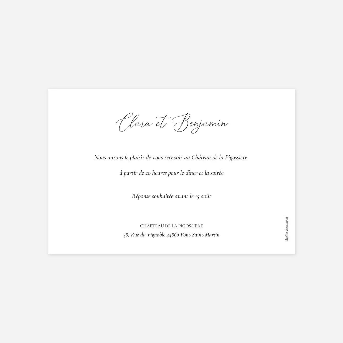 Avec simplicité et élégance, le carton d’invitation mariage Notre lieu complètera votre faire-part pour convier vos proches aux festivités qui suivront votre cérémonie. Cette gamme se distingue par une typographie au style manuscrit qui met en valeur votre texte. Au verso, un exemple de texte d’invitation vous inspire, que vous pouvez adapter avec vos informations via notre éditeur en ligne. Vous avez la liberté d’ajuster la police, la couleur et la taille de caractère selon vos préférences. Pour compléter vos invitations, découvrez également le carton réponse assorti dans la gamme Notre lieu. Si vous avez des questions, notre service client est à votre disposition.