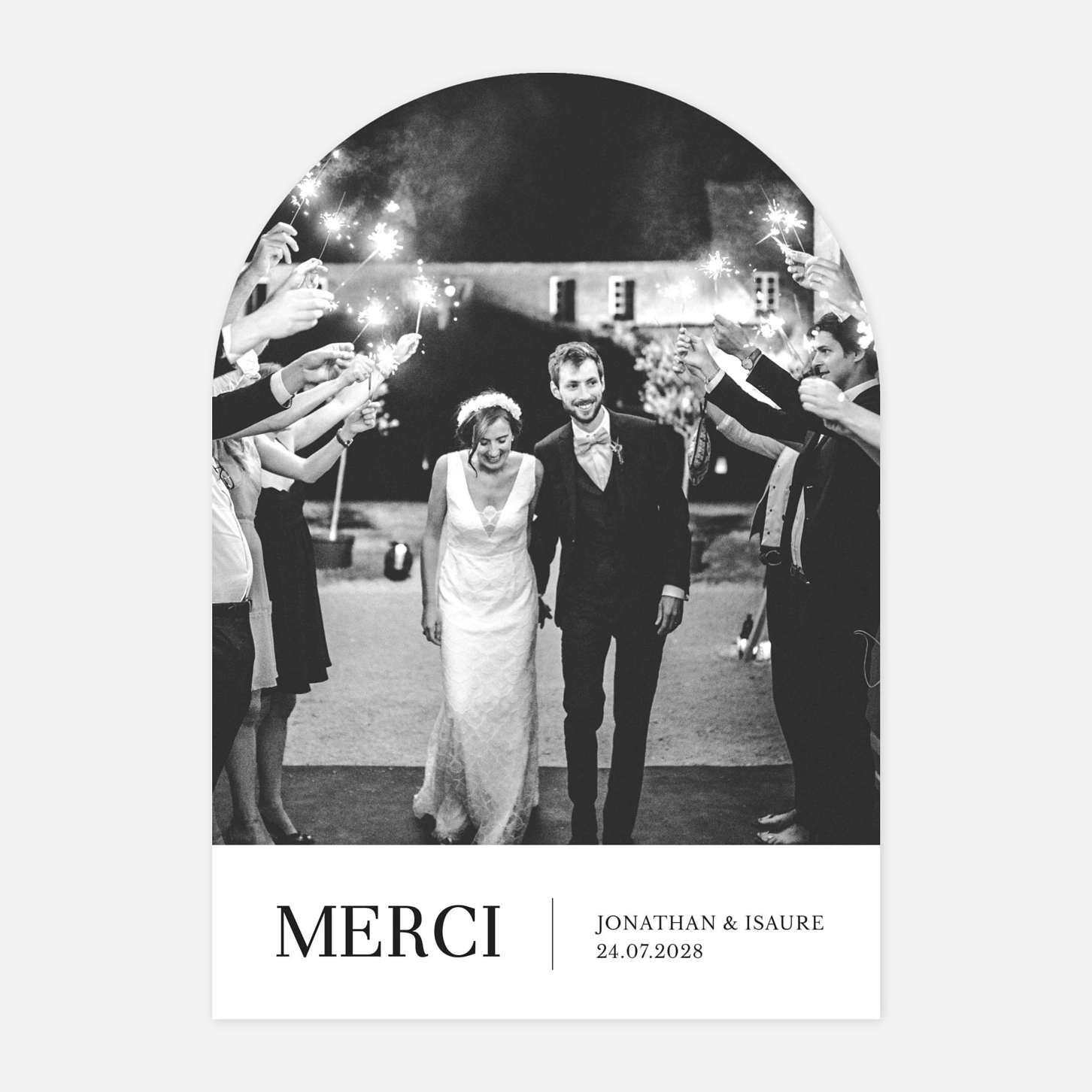 Sélectionnez votre photo préférée parmi les nombreux clichés de votre mariage et mettez-la en valeur avec la carte de remerciement mariage Bandeau chic 1 photo. Votre cliché en pleine page est subtilement souligné d’un bandeau blanc à personnaliser avec quelques mots. Profitez de cette mise en page moderne pour jouer avec des tailles de polices différentes. Sur notre carte de remerciement