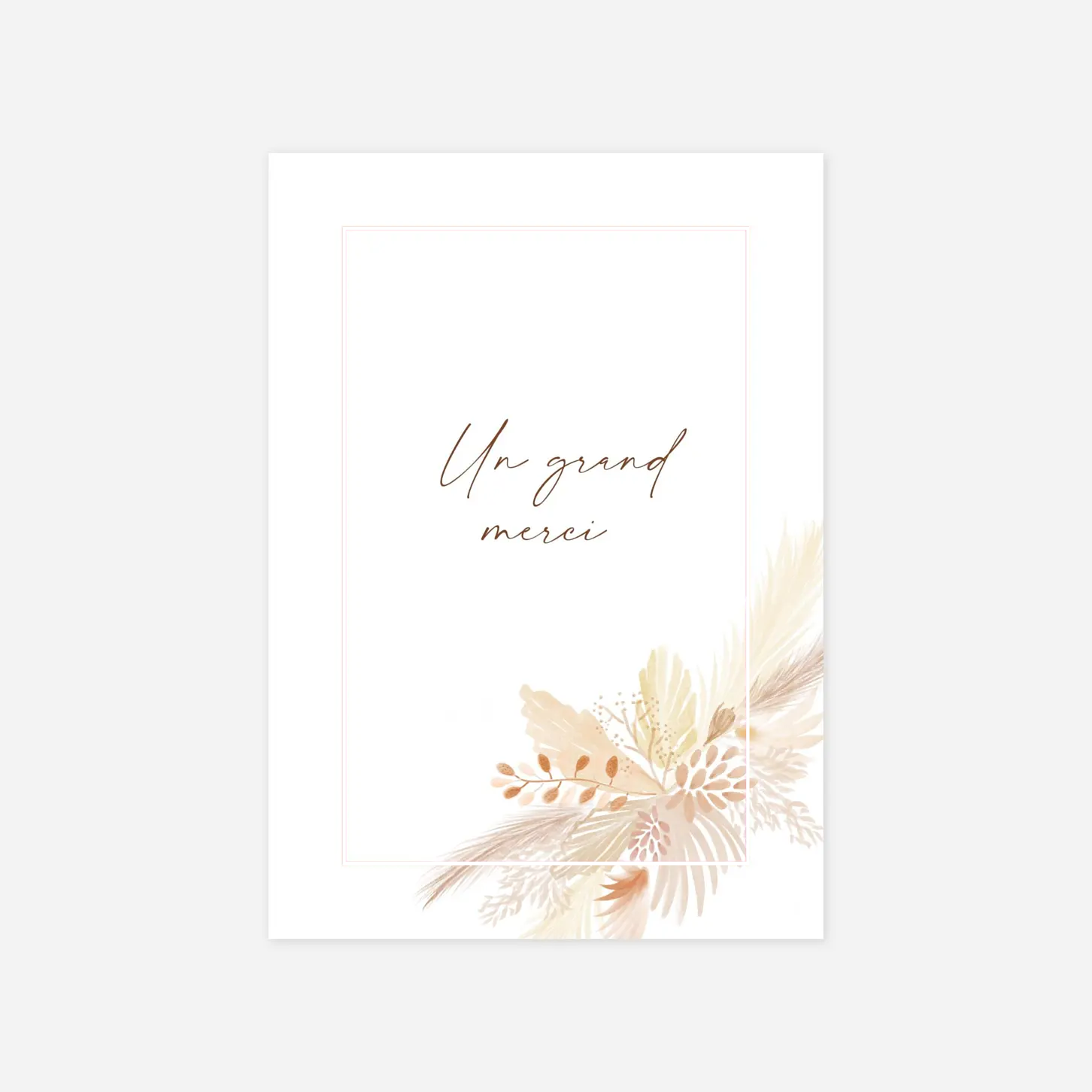 L’inspiration bohème était au cœur de votre union, alors pour remercier vos proches d’avoir été présents, la carte de remerciement mariage Bouquet bohème sera idéale ! Illustrée d’un délicat bouquet d’herbes séchées aux douces teintes pastel, elle évoque l’atmosphère légère et poétique du jour J. Une élégante typographie manuscrite met en avant votre “Merci”, le tout rehaussé d’un cadre raffiné. Le dos de la carte dévoile un joli cliché de votre couple pour accompagner votre message de remerciement. Cette carte se personnalise au recto et au verso avec votre texte et vos photos sur notre éditeur en ligne.