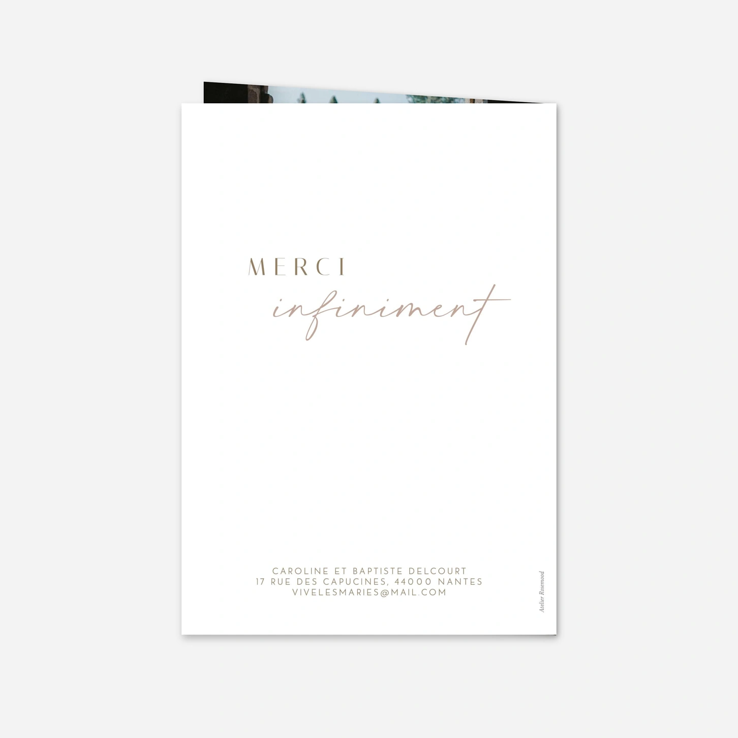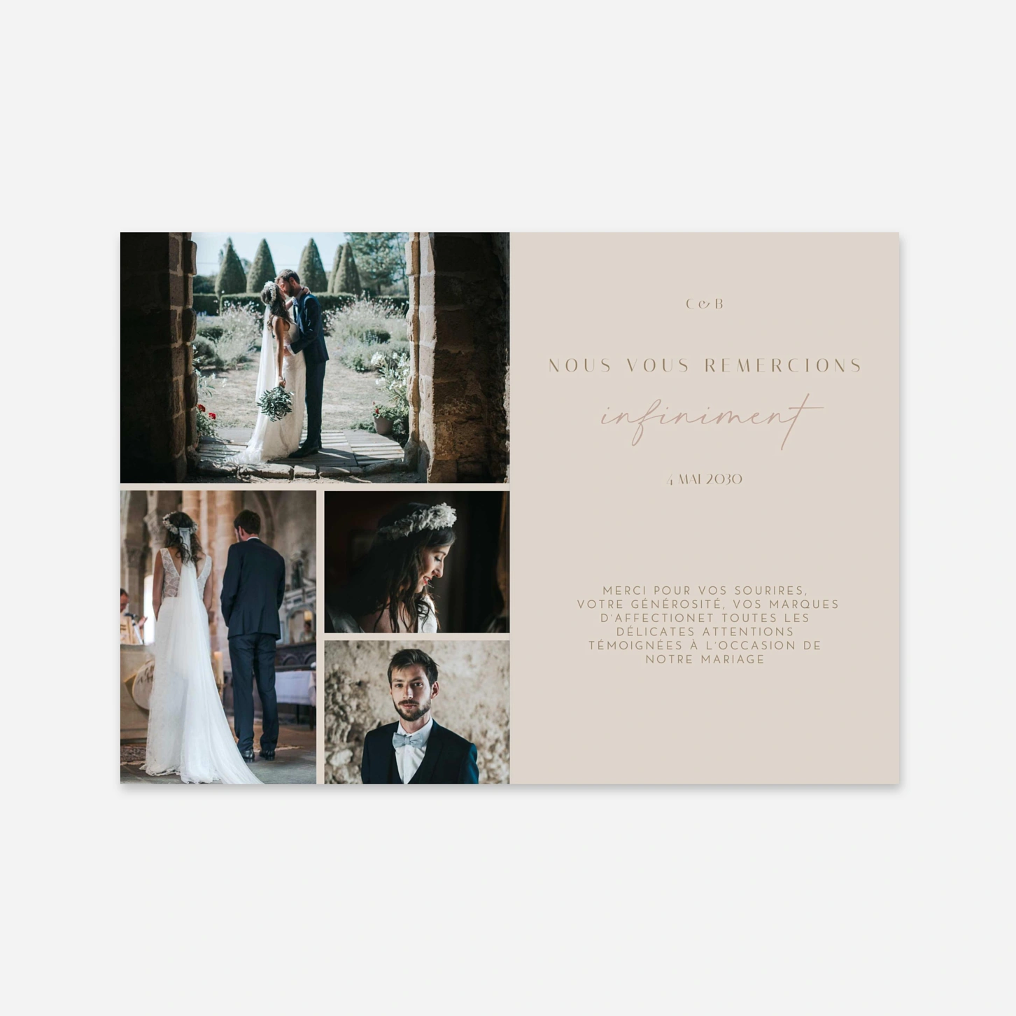 Grâce à sa mise en page en triptyque, la carte de remerciement de mariage « Felicità » vous permet de partager vos plus beaux souvenirs à travers trois clichés pleins de tendresse. Ce modèle élégant mettra en lumière l'émotion de votre union tout en adressant un message de gratitude sincère à vos proches. Nos créations sont conçues en interne pour vous offrir un rendu unique, sublimé par une impression de haute précision au cœur de nos ateliers. Personnalisez votre création en ligne dès maintenant pour prolonger la magie de votre grand jour.
