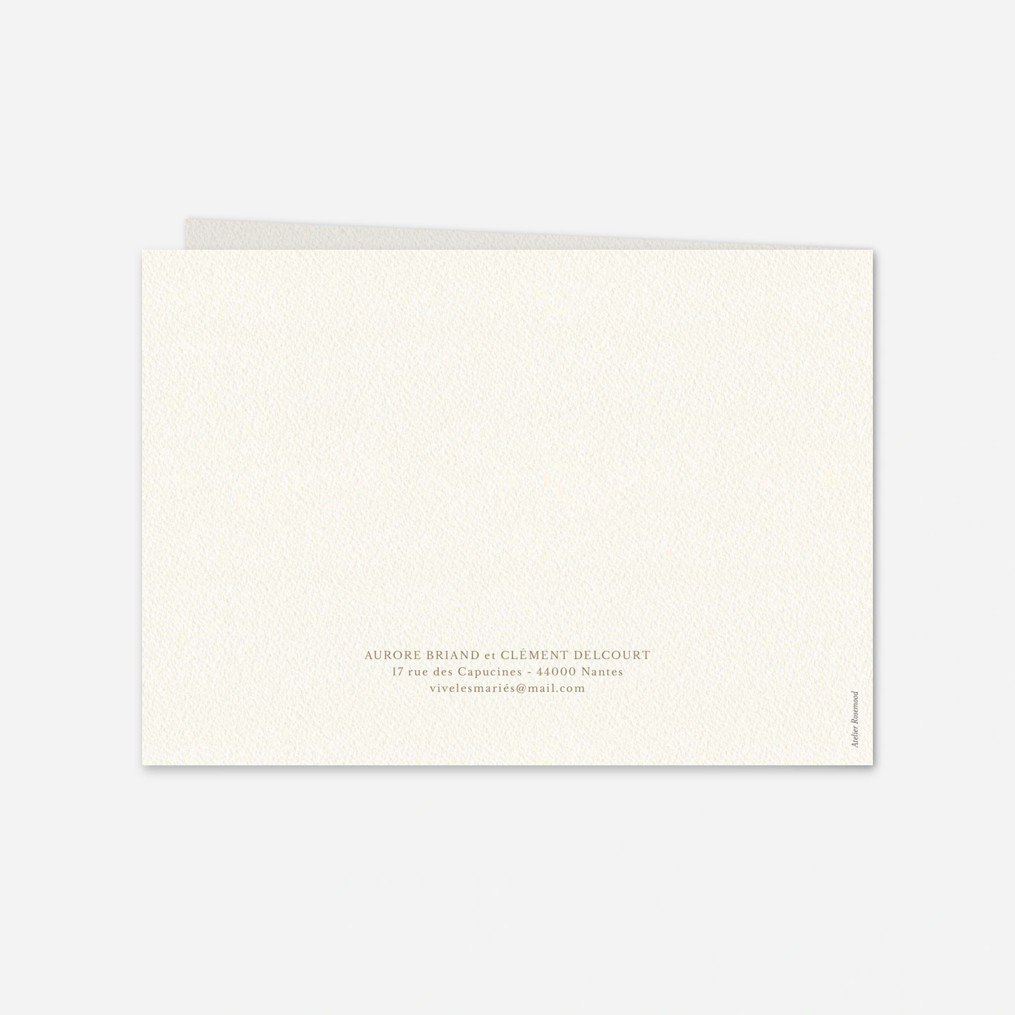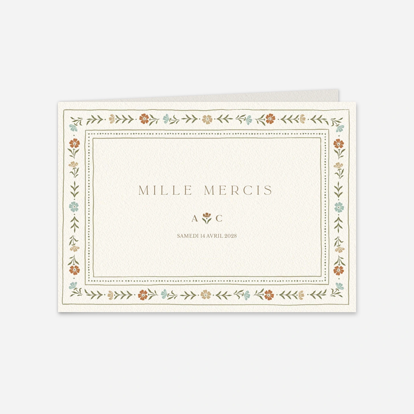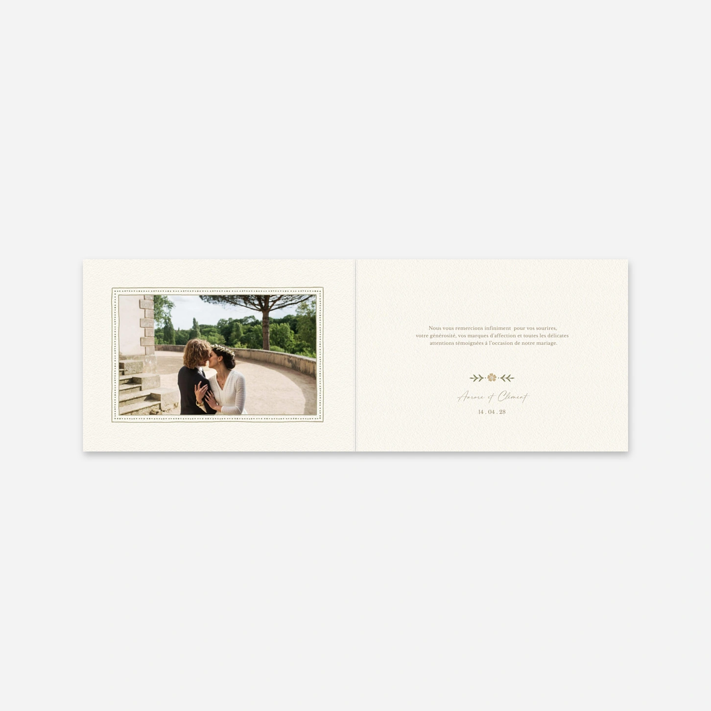 Assortie à votre papeterie, la carte de remerciement personnalisée « Jardin éternel » est une attention élégante pour remercier vos proches et leur laisser un joli souvenir de votre grand jour. Personnalisez-la facilement depuis notre éditeur en ligne.