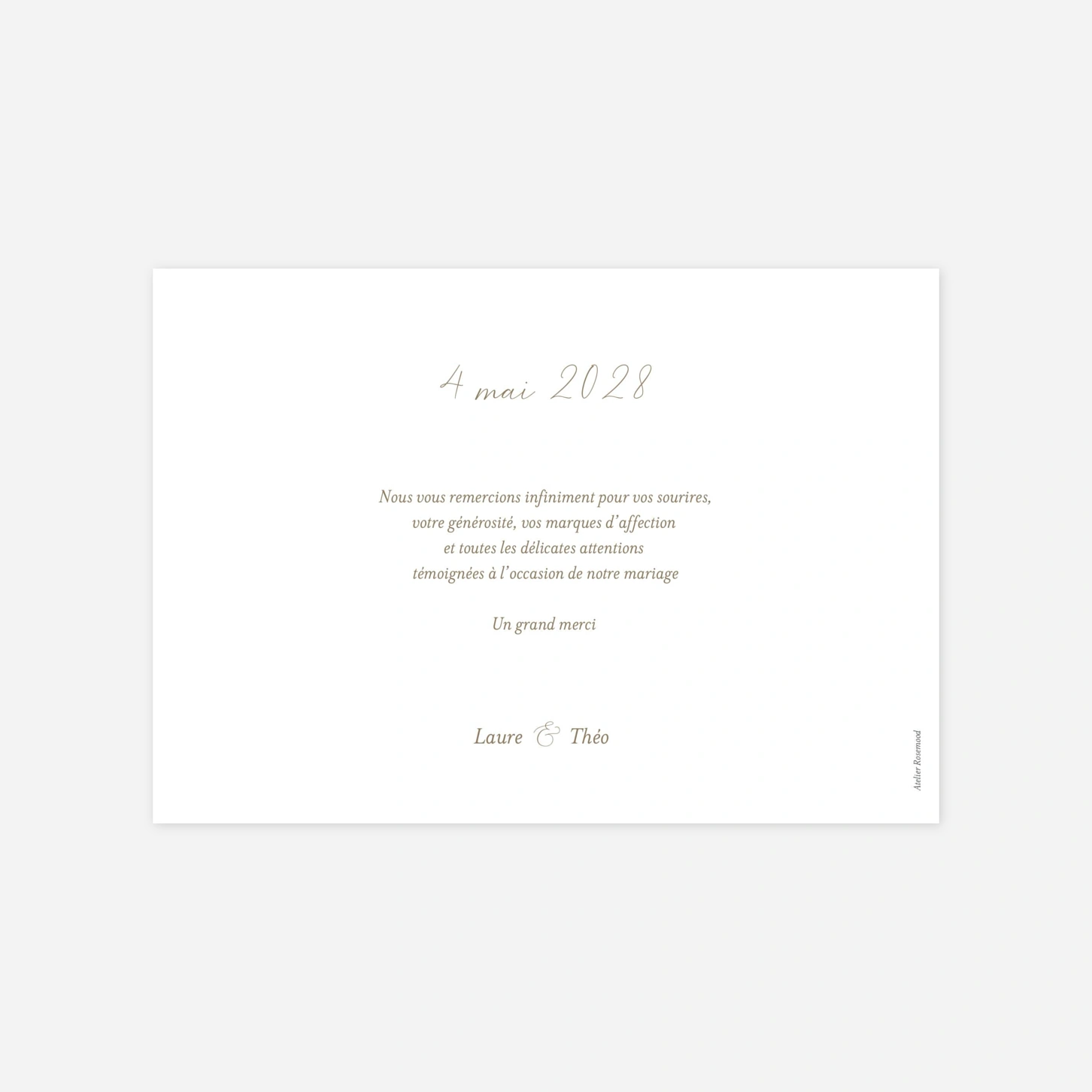 Assortie à votre papeterie, la carte de remerciement personnalisée « Notre journée » est une attention élégante pour remercier vos proches et leur laisser un joli souvenir de votre grand jour. Personnalisez-la facilement depuis notre éditeur en ligne.