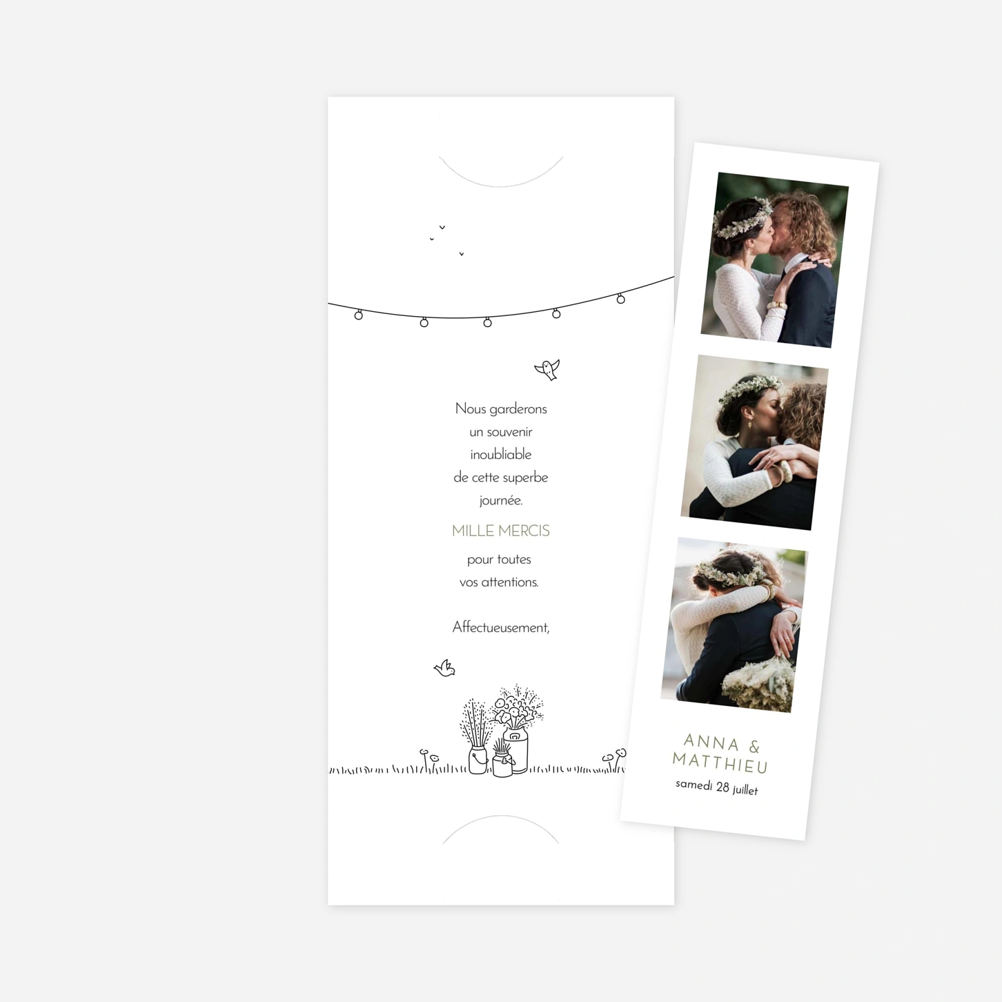 La Carte de Remerciement – Promesse Bohème se distingue par son design doux et épuré, aux motifs floraux et végétaux, parfaitement équilibré pour refléter un style bohème sophistiqué. Que vous ayez célébré un mariage en pleine nature ou souhaitiez simplement exprimer vos remerciements avec simplicité et élégance, ce modèle s’accorde à toutes les occasions.