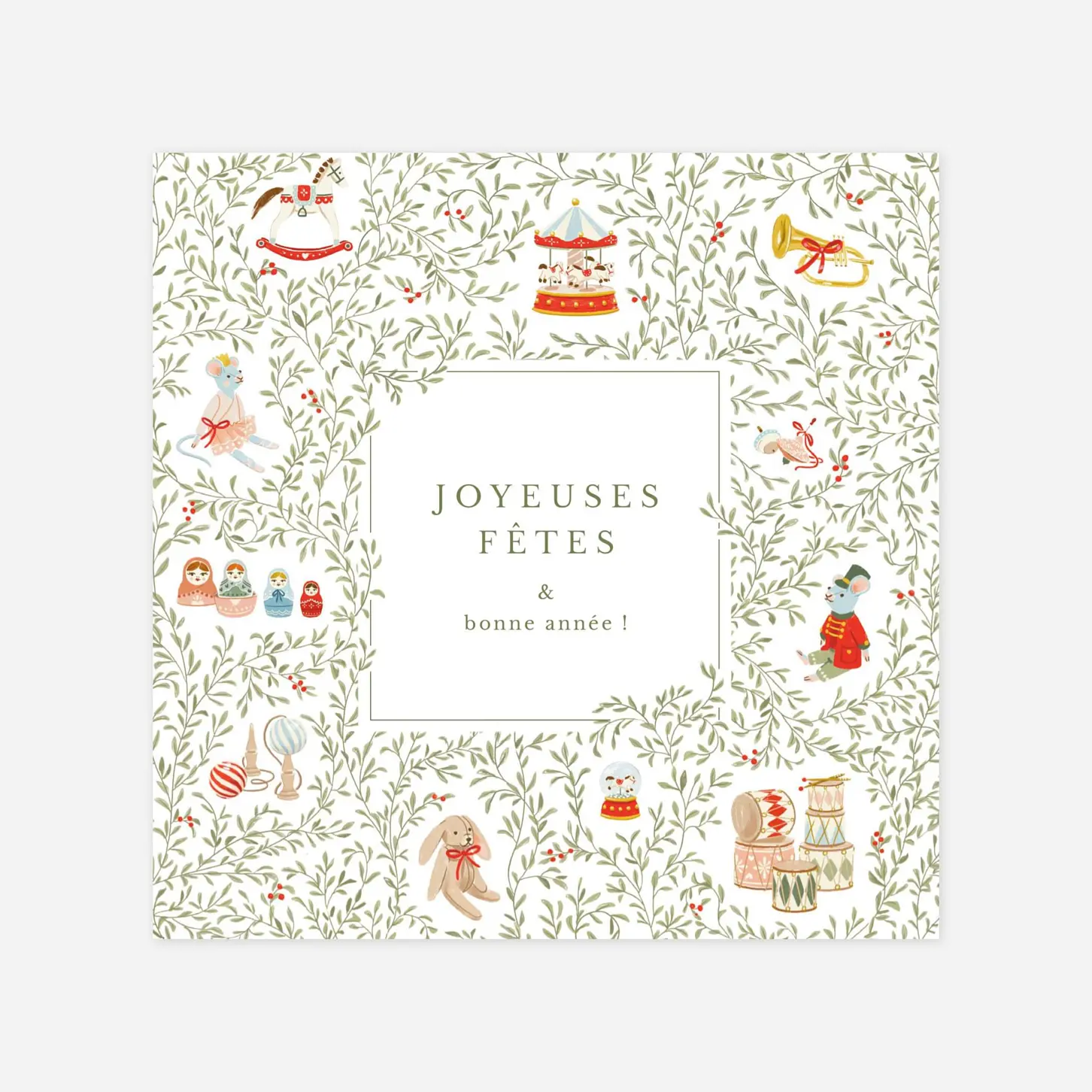 Plongez dans l'esprit de Noël avec la carte de voeux "En attendant Noël". Ses illustrations végétales et festives mêlant jouets d'antan transmettront vos voeux avec douceur et élégance. Personnalisez votre carte en ligne avec votre texte et une jolie photo de famille.