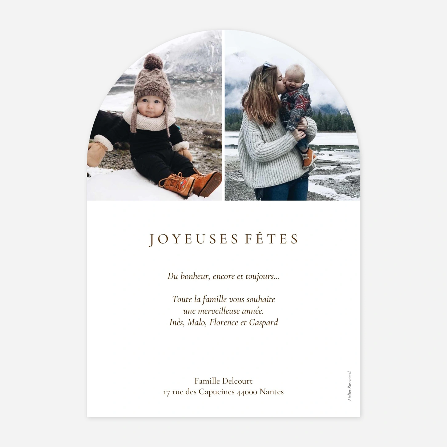La carte de vœux « Fenêtre sur l’hiver » capture la magie des fêtes à travers une scène empreinte de tendresse et de poésie. Comme si vos proches regardaient par la fenêtre d’un chalet enneigé, elle révèle vos plus beaux souvenirs dans une ambiance douce et lumineuse. Cette carte de vœux personnalisée transmettra avec chaleur vos souhaits pour la nouvelle année. Imprimée sur nos papiers de création dans nos ateliers en France et en Allemagne, elle allie authenticité et savoir-faire artisanal. Personnalisez votre modèle en ligne dès maintenant pour partager vos vœux avec élégance.