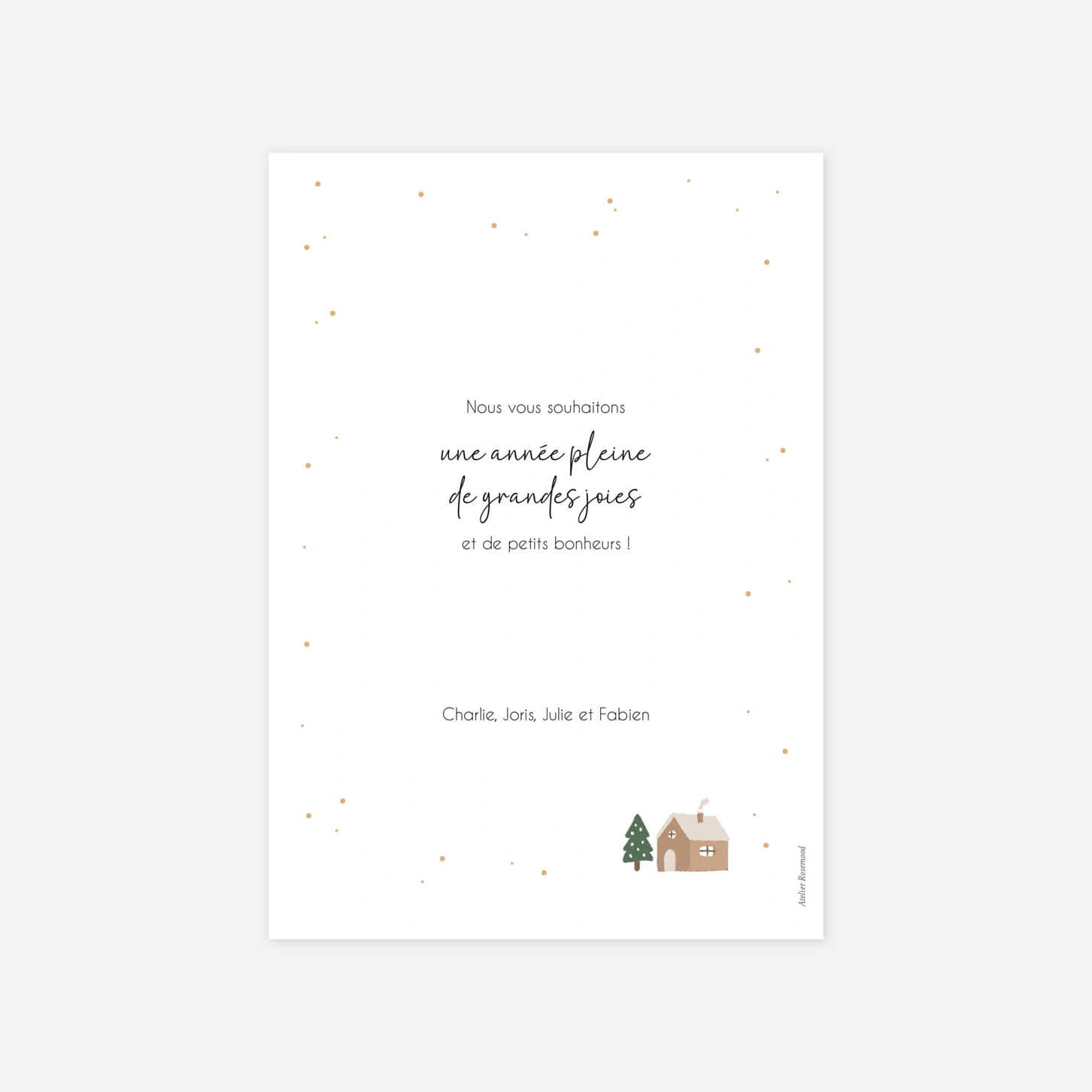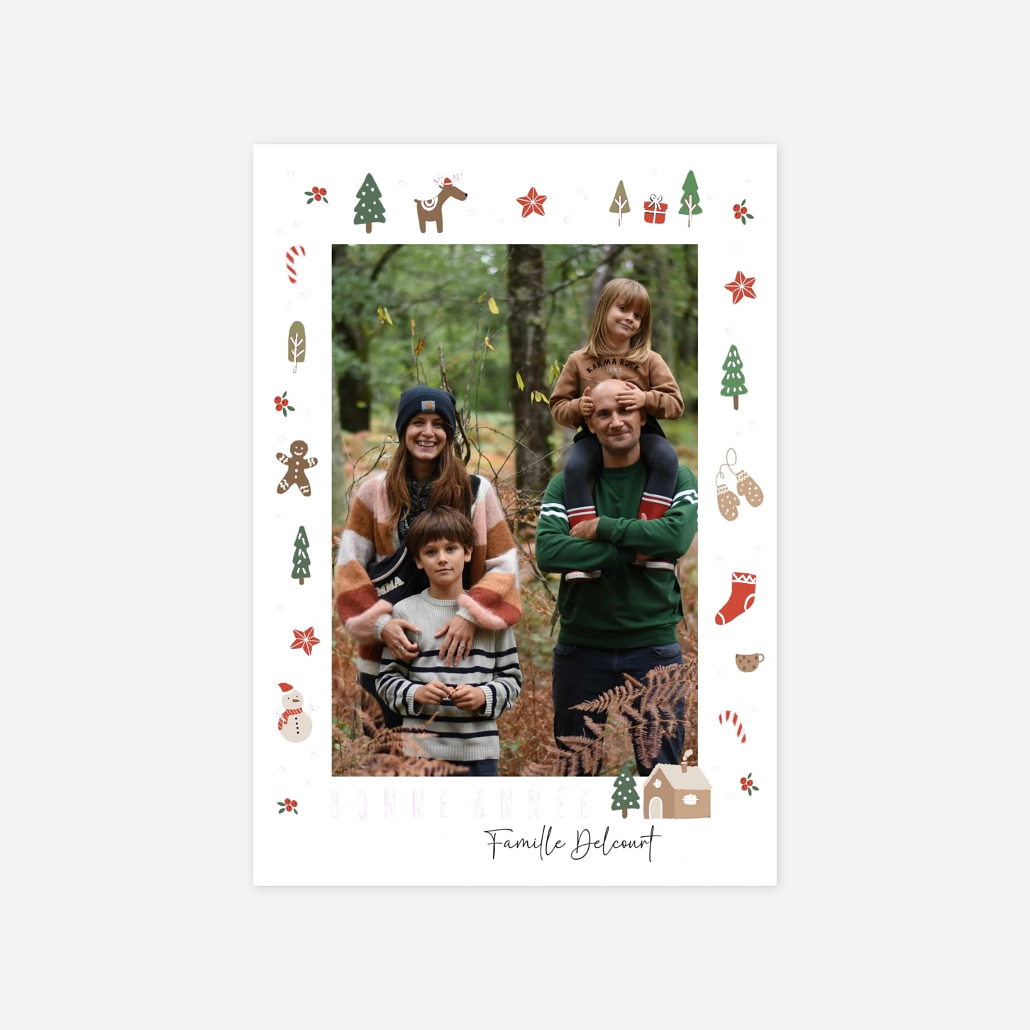 Partagez la magie des fêtes avec joie grâce à la carte de vœux « Fête enchantée », un modèle festif qui encadre joliment votre portrait de famille. Ses illustrations ludiques et colorées de rennes, sapins et bonhommes de neige apportent une touche de gaieté unique à vos vœux de fin d'année. Toutes nos créations sont imaginées en interne afin de vous proposer une papeterie soignée et pleine de vie. Nous assurons une impression haute précision dans nos propres ateliers pour garantir un rendu parfait à vos plus beaux souvenirs. Personnalisez facilement votre texte et votre cliché en ligne pour envoyer une attention inoubliable à tous vos proches.