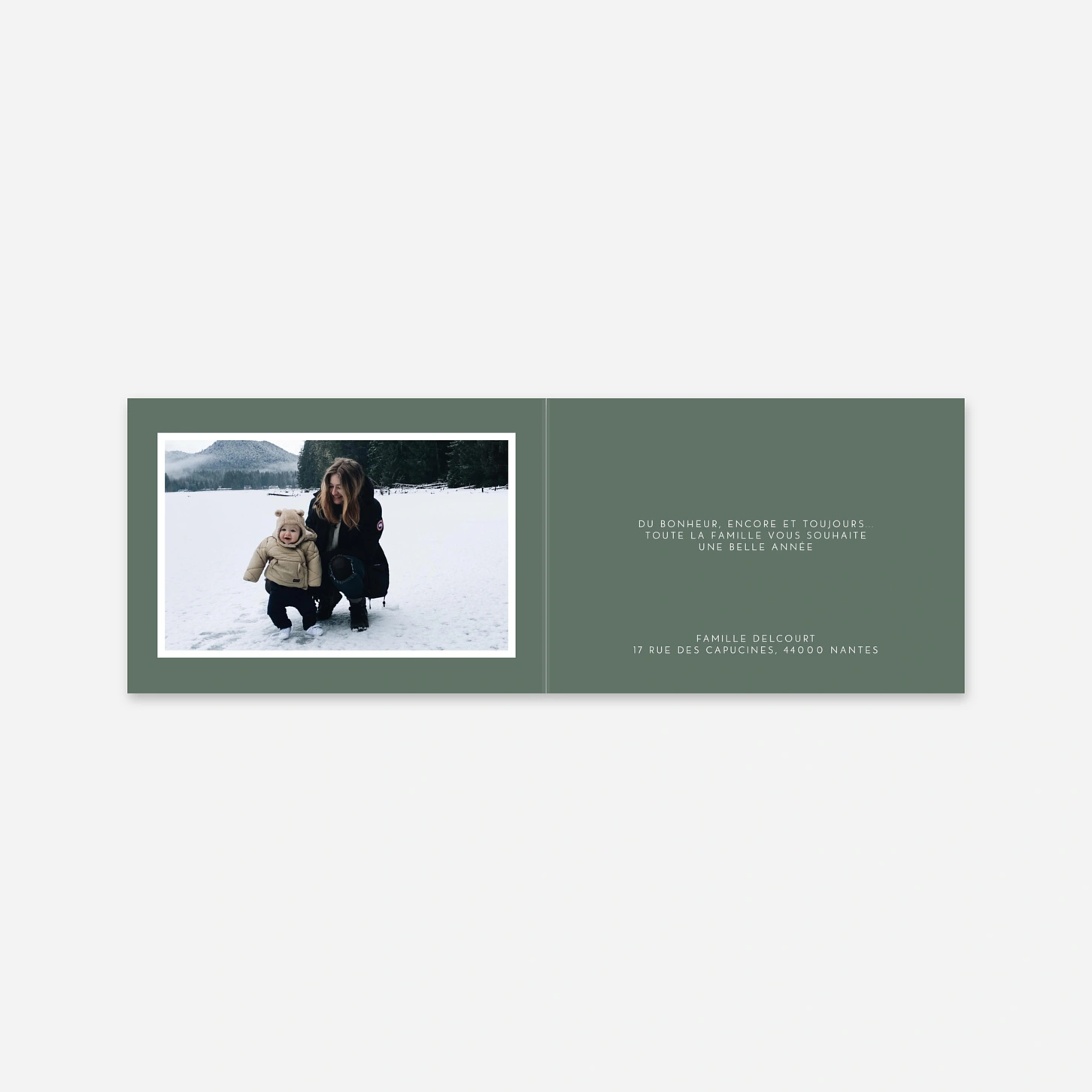 La carte de voeux Liberty feuillage sera parfaite pour souhaiter de joyeuses fêtes et une merveilleuse année à vos proches. Son splendide feuillage composé de branches de gui, de houx et de fougères illustré sur le devant de la carte plongera vos proches dans une douce ambiance hivernale et dans l’esprit chaleureux des fêtes de Noël. Partagez vos plus beaux souvenirs de cette année passée en images au dos de votre carte et accompagnez-les de tous vos souhaits de bonheur, de santé et d’amour pour le passage à la nouvelle année. Choisissez la couleur de votre modèle puis personnalisez votre création via notre logiciel d’édition.