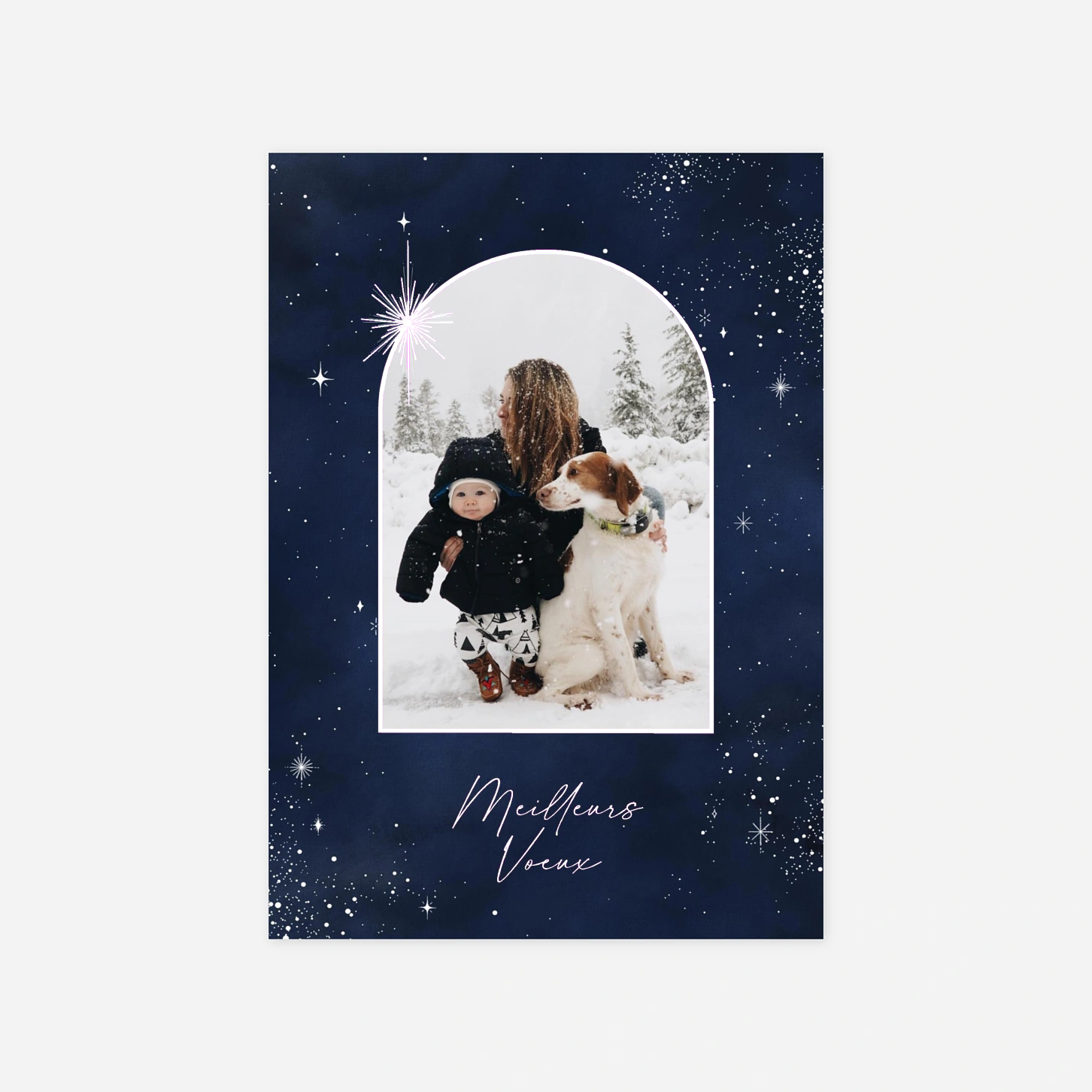 Un ciel bleu nuit illuminé de constellations et vos plus belles photos de l'année, célébrez la magie des fêtes avec la carte de voeux Nuit étoilée ! Personnalisez votre carte en ligne avec votre texte et vos photos. Service de retouche inclus, impression réalisée sur nos plus beaux papiers de création.