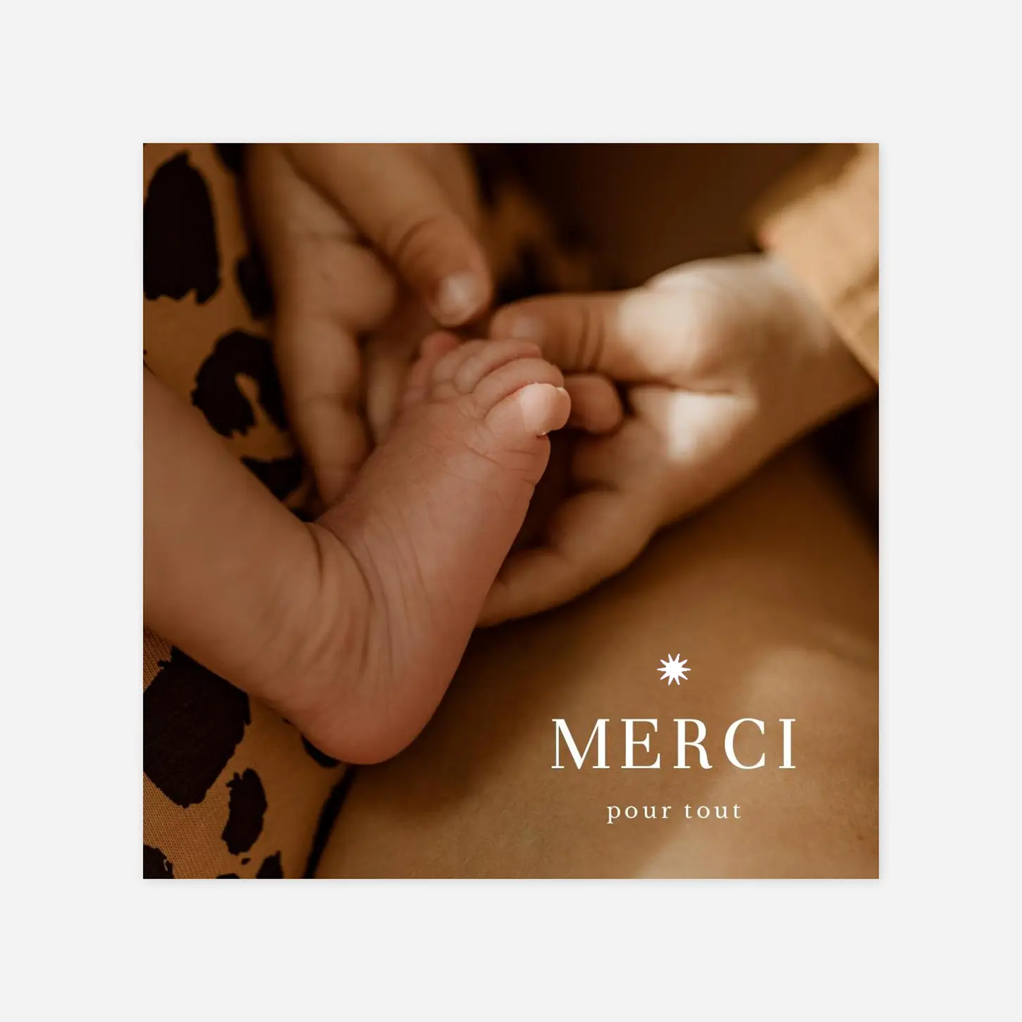 Célébrez la venue de votre petite étoile avec élégance grâce à notre carte de remerciement de naissance personnalisable, « Une Étoile est Née ». Idéale pour exprimer vos remerciements à vos proches tout en partageant un souvenir inoubliable, cette carte allie un design raffiné à une qualité d’impression exceptionnelle.