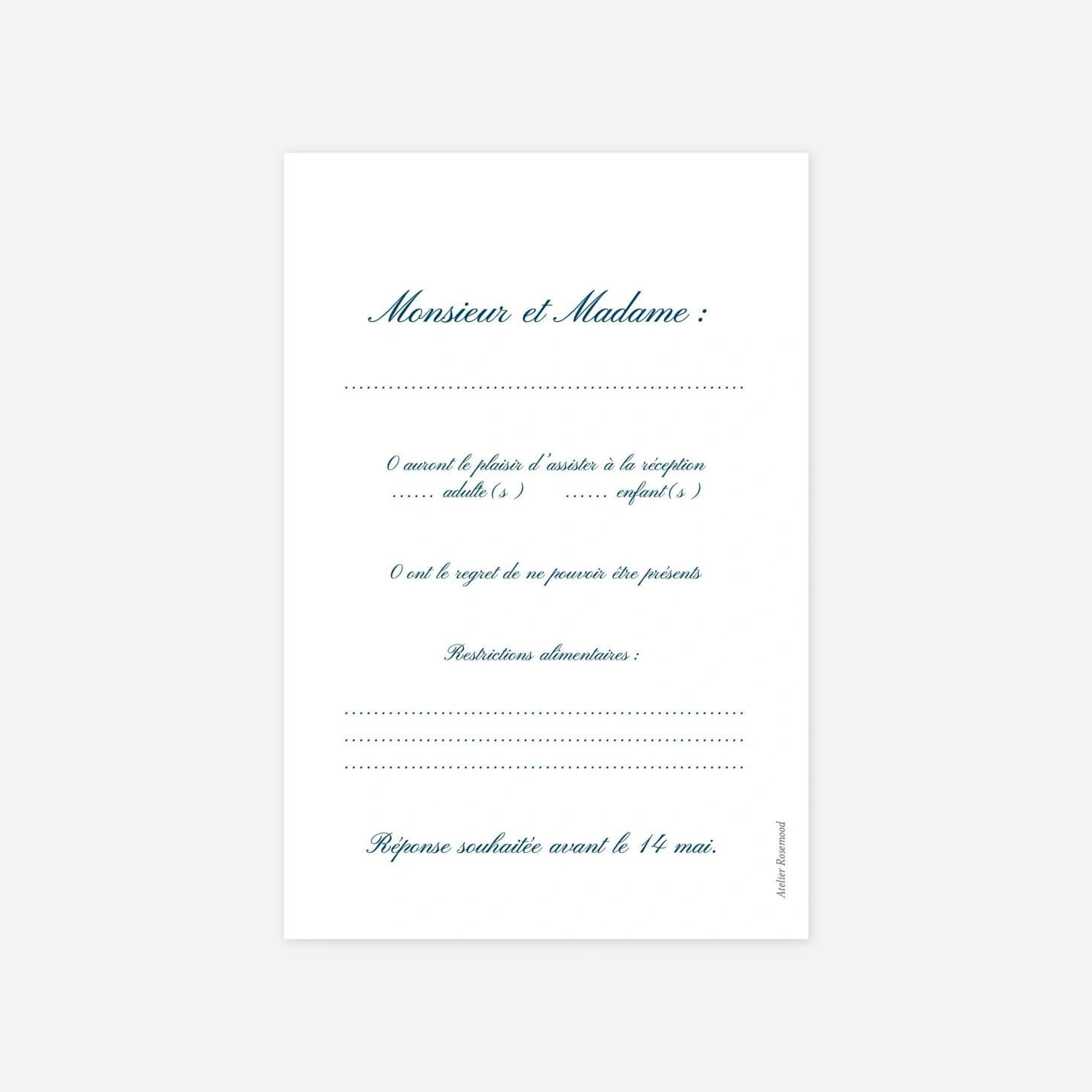 Associez le carton réponse mariage « Élégante Aquarelle » au faire-part du même nom pour compléter votre courrier d’invitation. Vos destinataires pourront ainsi vous indiquer s’ils seront présents aux festivités suivant la cérémonie, et vous préciser également d’éventuelles restrictions alimentaires pour le repas ou d’autres éléments pouvant faciliter votre organisation.