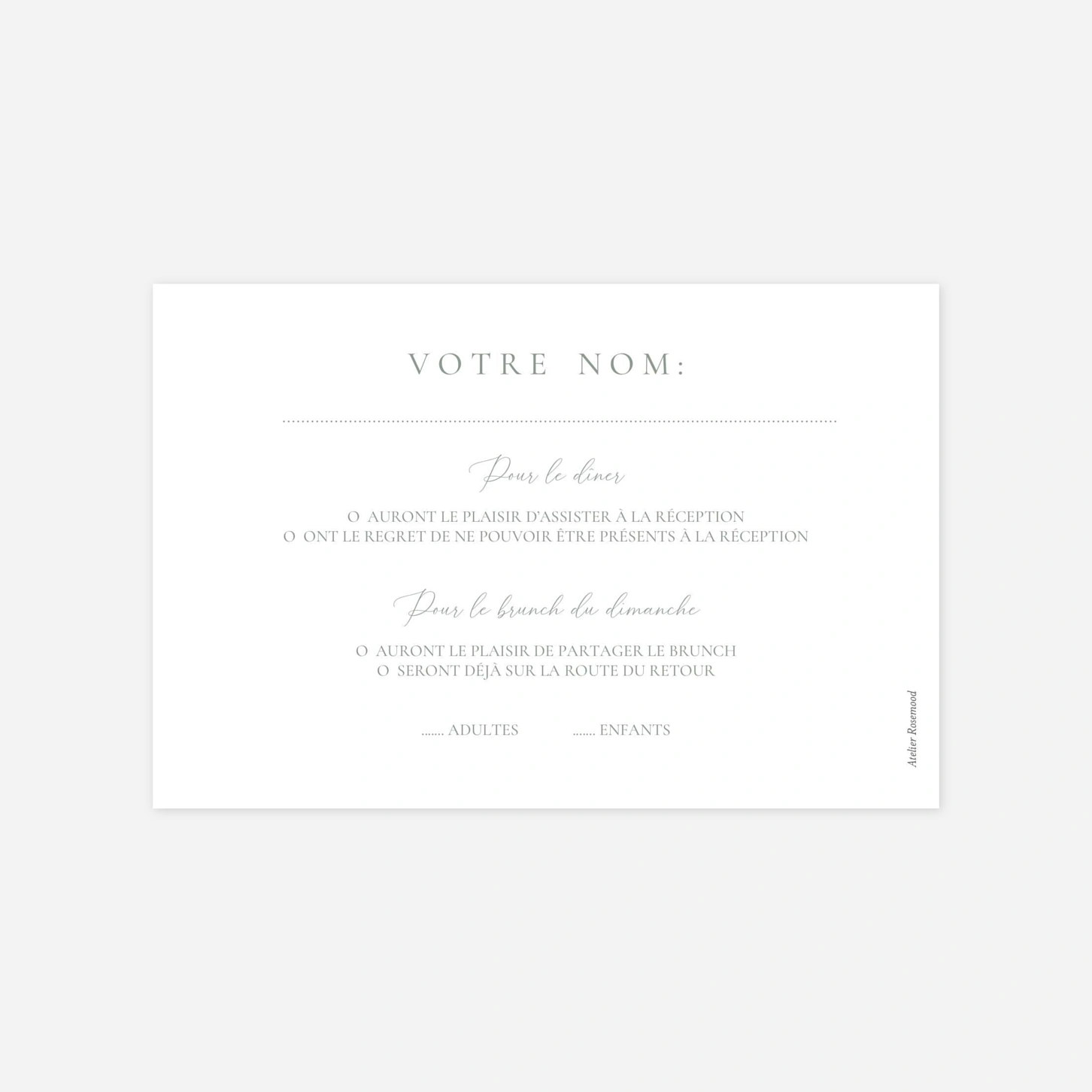 Associez le carton réponse mariage Union d’Amour au faire-part du même nom pour compléter votre courrier d’invitation. Vos destinataires pourront ainsi vous indiquer s’ils seront présents aux festivités suivant la cérémonie, et vous préciser également d’éventuelles restrictions alimentaires pour le repas ou d’autres éléments pouvant faciliter votre organisation. Vos convives auront un avant-goût du thème choisi pour votre union à l’ouverture de votre missive.