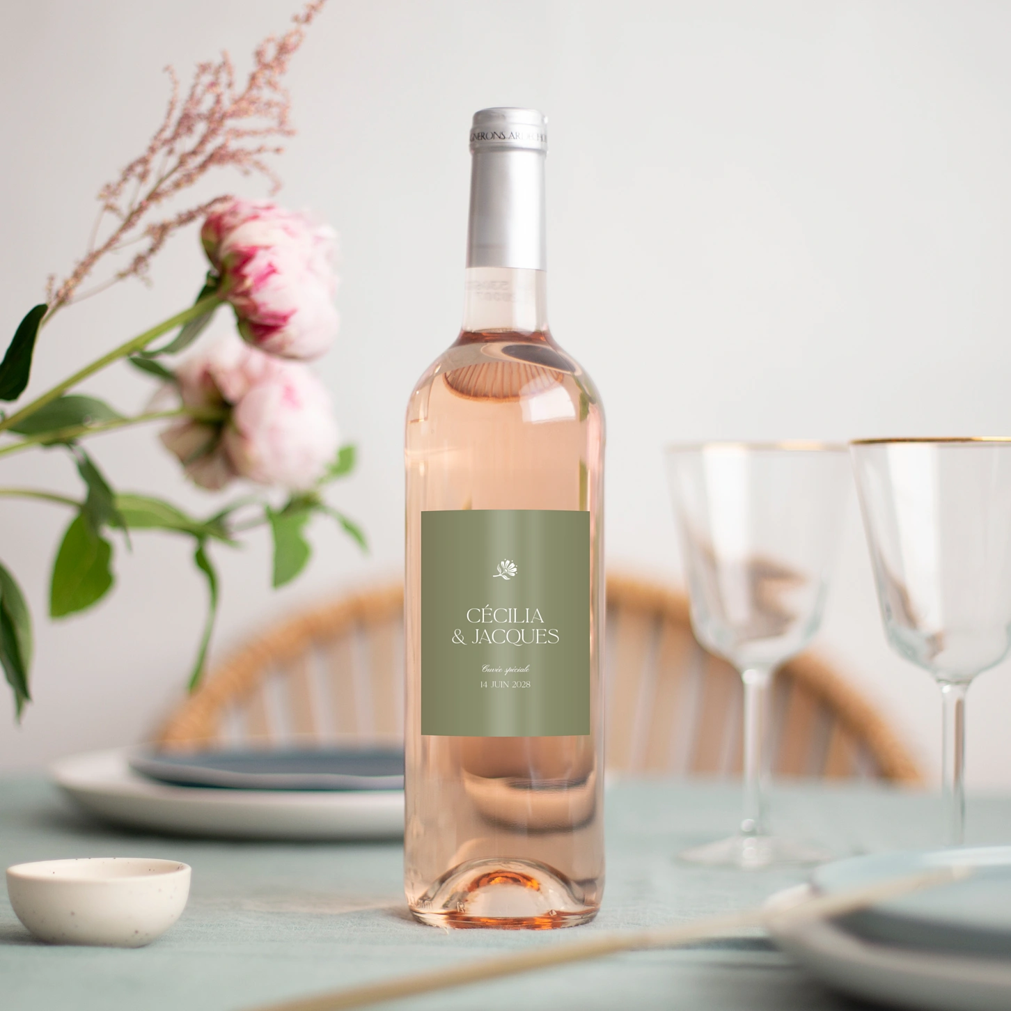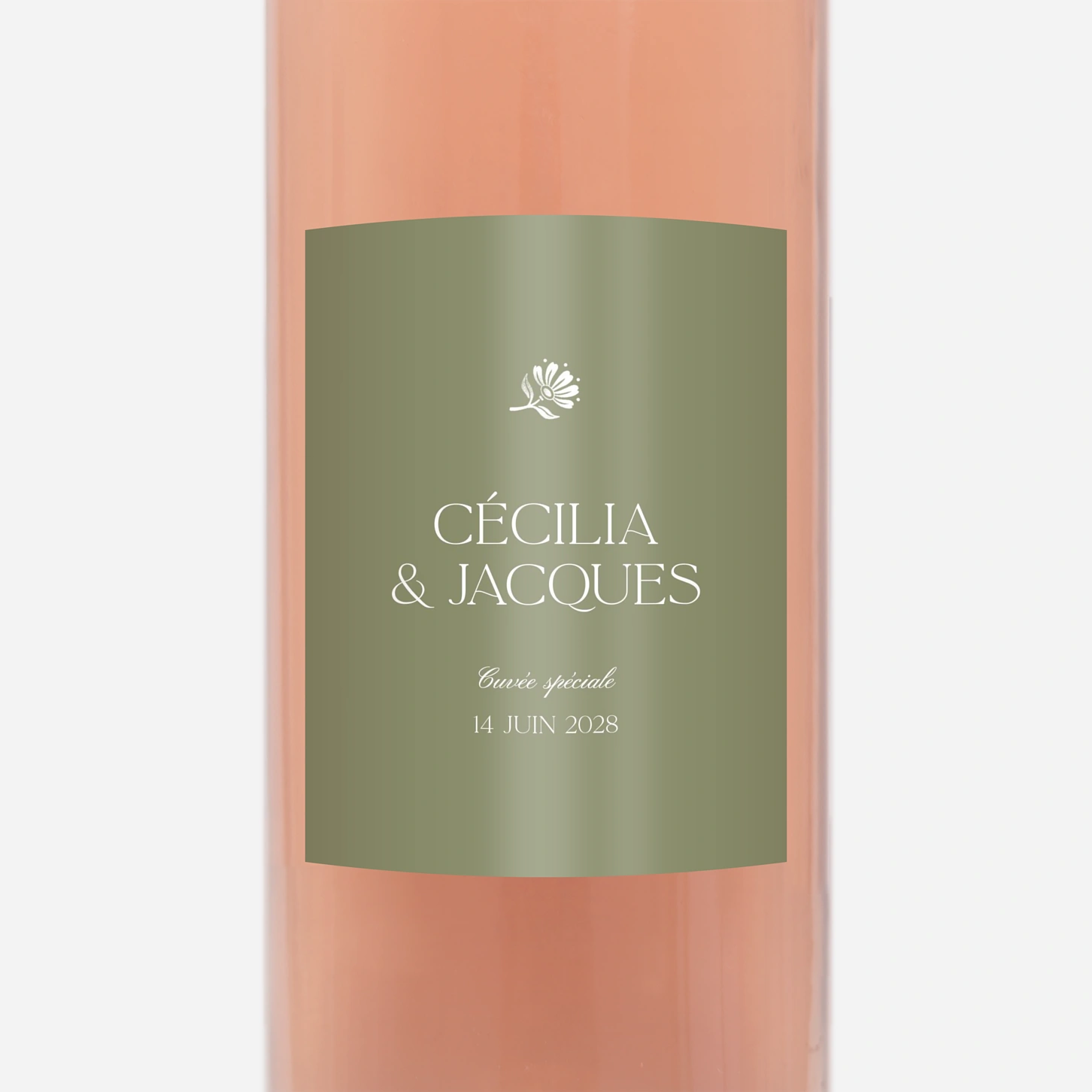 Assorties à votre papeterie, les étiquettes personnalisées « Fleur minimale » sauront sublimer vos vins, champagnes et carafes d’eau. Elles seront également un joli rappel du thème de votre décoration. Cette étiquette se personnalise sur notre éditeur en ligne avec le texte de votre choix : vos prénoms, la date et le lieu de votre union, l’appellation de vos vins…