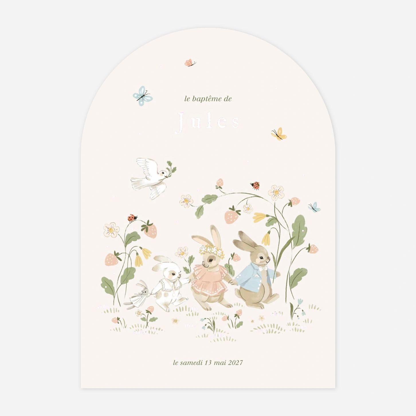 Avec ses adorables petits animaux et son décor champêtre plein de douceur, le faire-part de baptême « Baptême au jardin » invite vos proches à partager une célébration lumineuse et poétique. Cette invitation de baptême, à la fois tendre et élégante, se personnalise facilement avec votre texte pour créer un faire-part de baptême personnalisé à votre image. Imprimé avec haute précision, il mettra en valeur chaque détail dans nos ateliers de production en France et en Allemagne. Personnalisez votre annonce en ligne dès maintenant.