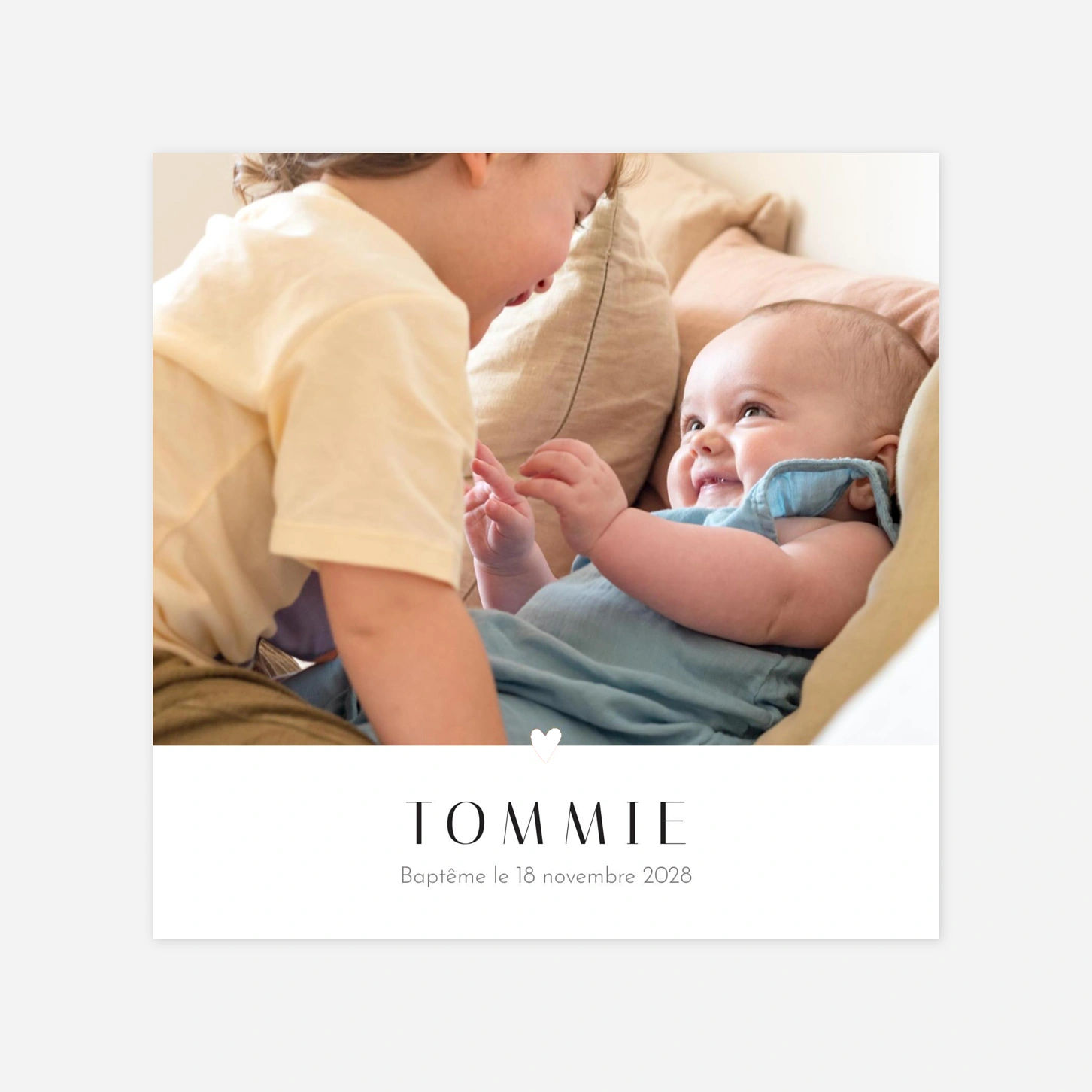 Voici une carte au design sobre et minimaliste pour annoncer avec élégance l’événement. Sous son apparente simplicité, le faire-part de baptême Coeur d’or dévoile un détail très raffiné : ce petit cœur doré qui viendra rehausser la plus jolie photo du futur baptisé ! Ce délicat motif illuminera vos invitations et leur apportera une touche de raffinement supplémentaire. Une typo graphique et épurée mettra en avant le prénom de votre enfant, suivi de la date de la cérémonie. Personnalisez votre faire-part sur notre éditeur en ligne. Un service de retouche est inclus dans votre commande. Impression haut de gamme au coeur de notre atelier, sur de beaux papiers de création.