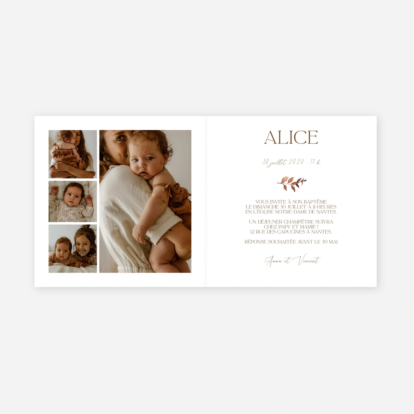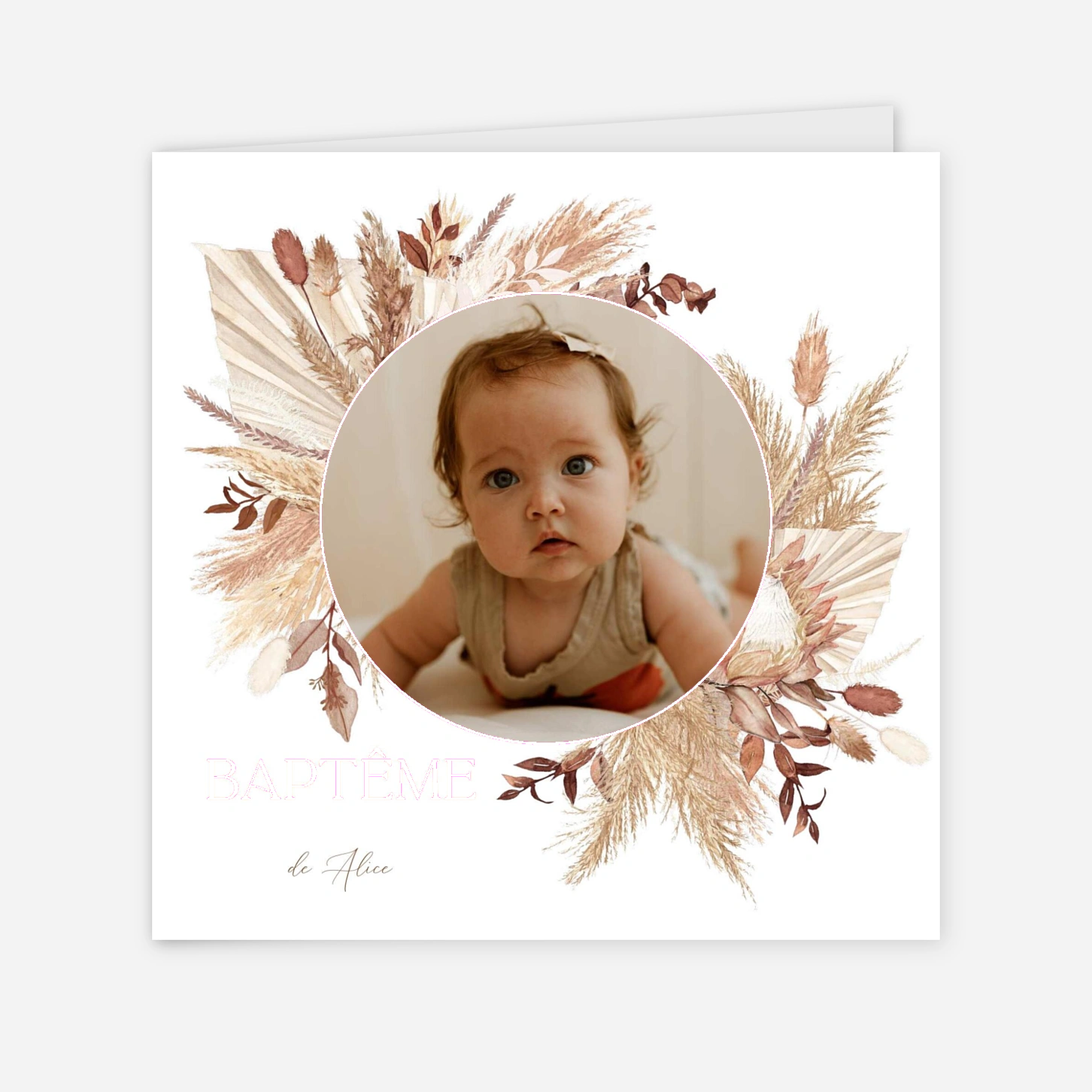 Le faire-part de baptême « Fleurs séchées » célèbre ce moment précieux avec une douceur naturelle et une élégance intemporelle. Son univers végétal encadre délicatement la photo de votre enfant pour une annonce de baptême élégante et pleine de sens. Ce faire-part de baptême personnalisé se configure facilement en ligne avec votre texte et vos photos, pour une création qui vous ressemble. Imaginé par nos équipes et imprimé avec soin dans nos ateliers en France et en Allemagne, il accompagnera ce jour unique d’une attention raffinée.