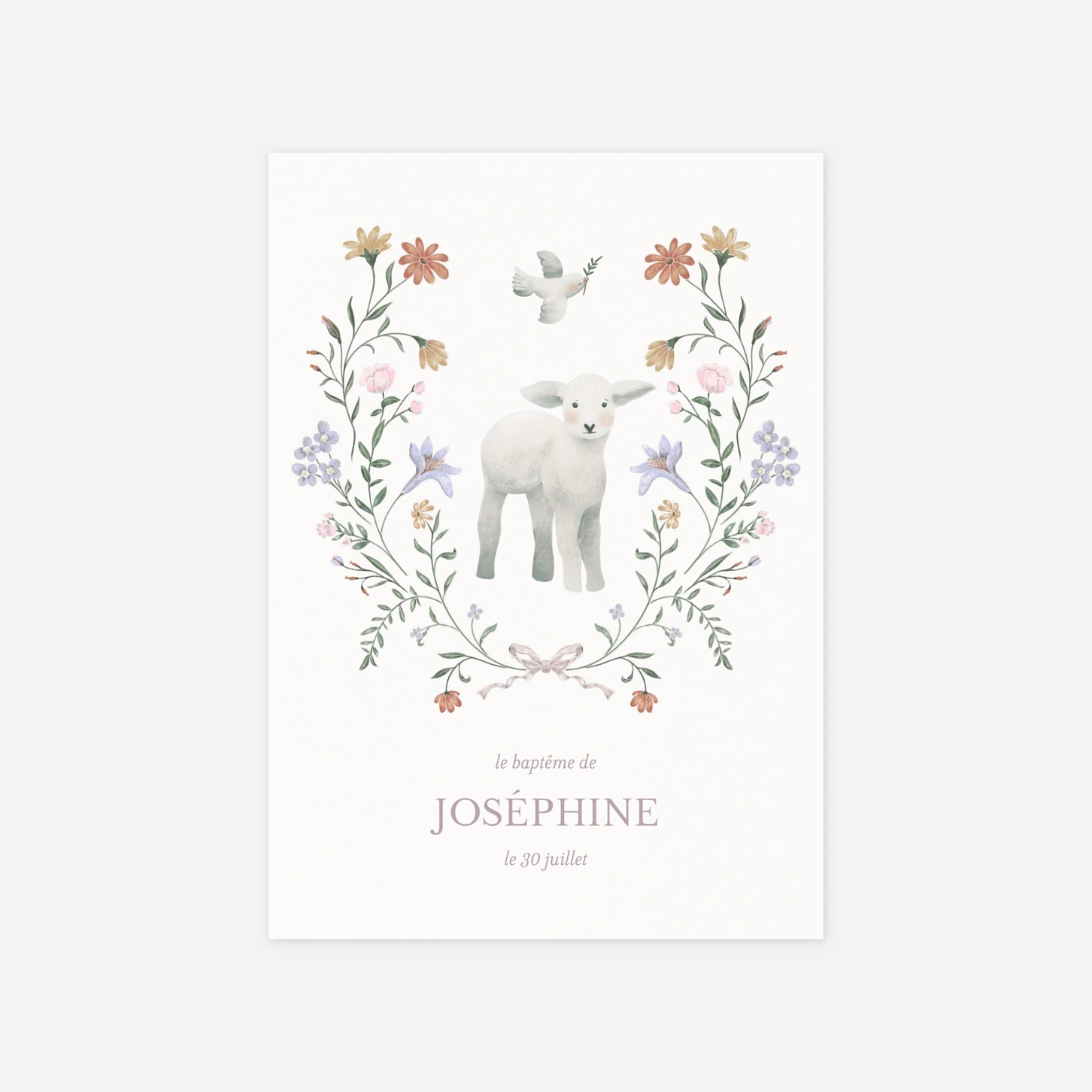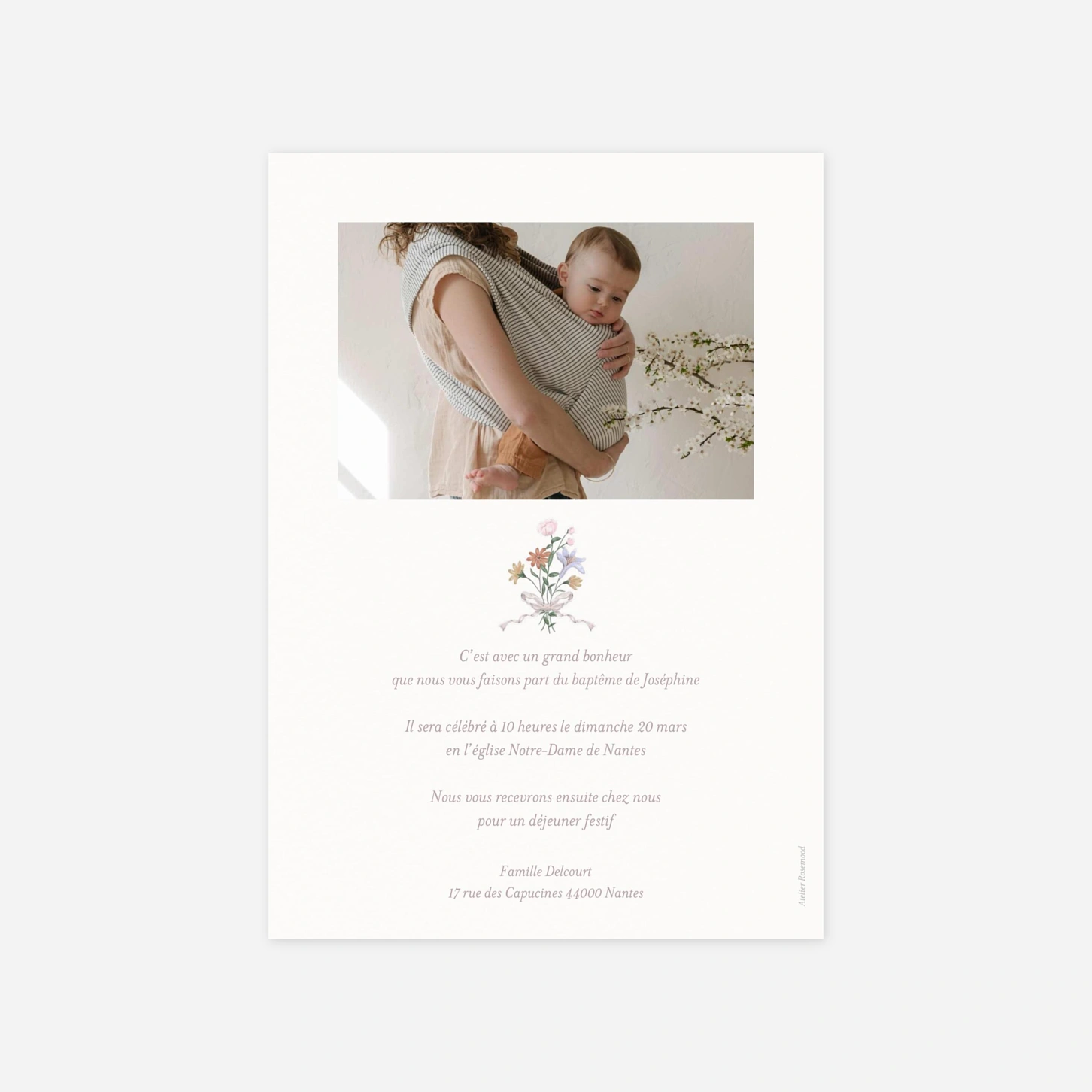 Le faire-part de baptême « Jardin de Grâce » enveloppe votre annonce d’une douceur poétique grâce à sa délicate illustration florale et son univers empreint de tendresse. Ce faire-part de baptême personnalisé vous permet d’ajouter vos photos et votre texte en toute simplicité pour créer une carte qui vous ressemble. Il est imprimé avec soin sur nos papiers premium dans nos propres ateliers en France et en Allemagne. Une jolie manière de partager ce moment précieux avec vos proches.
