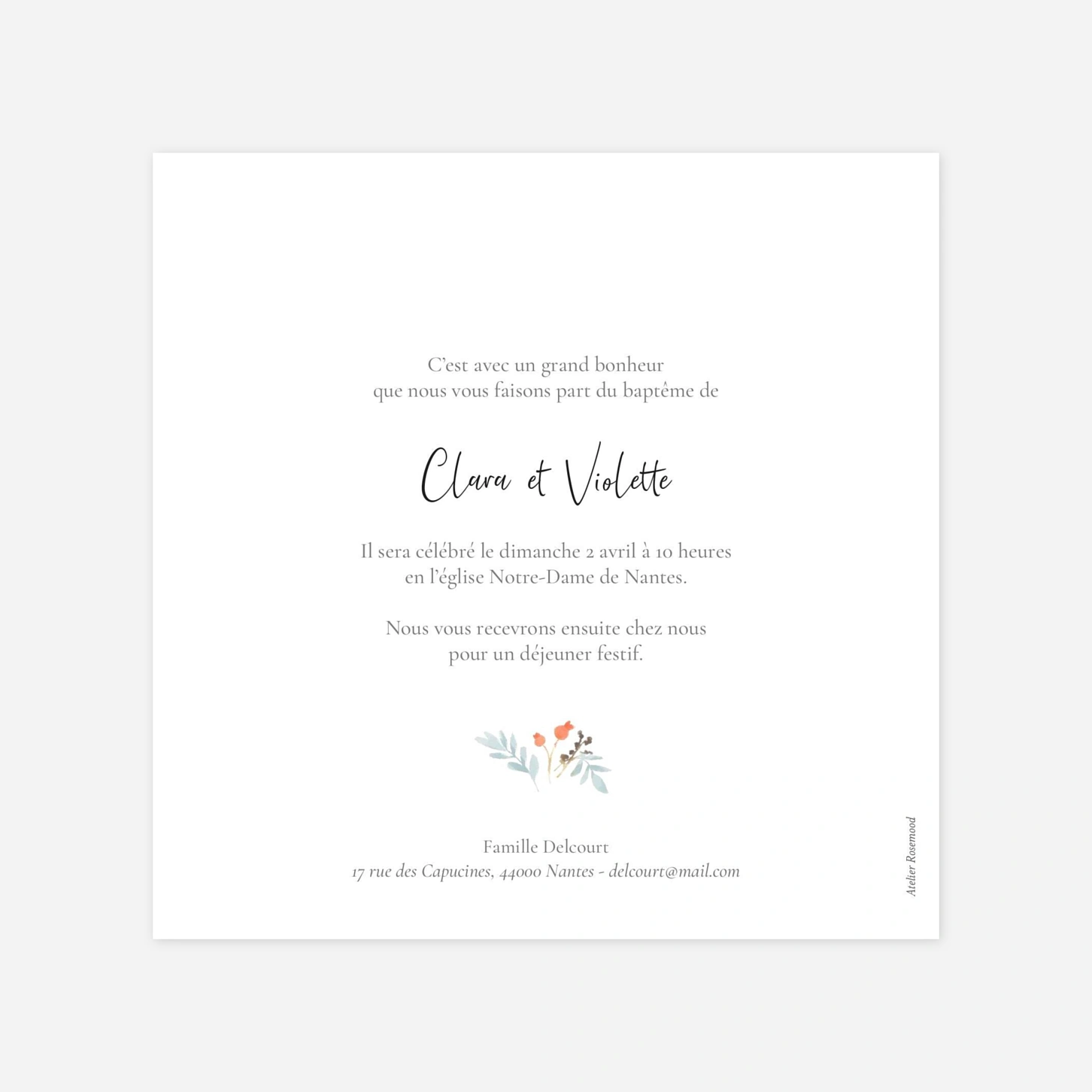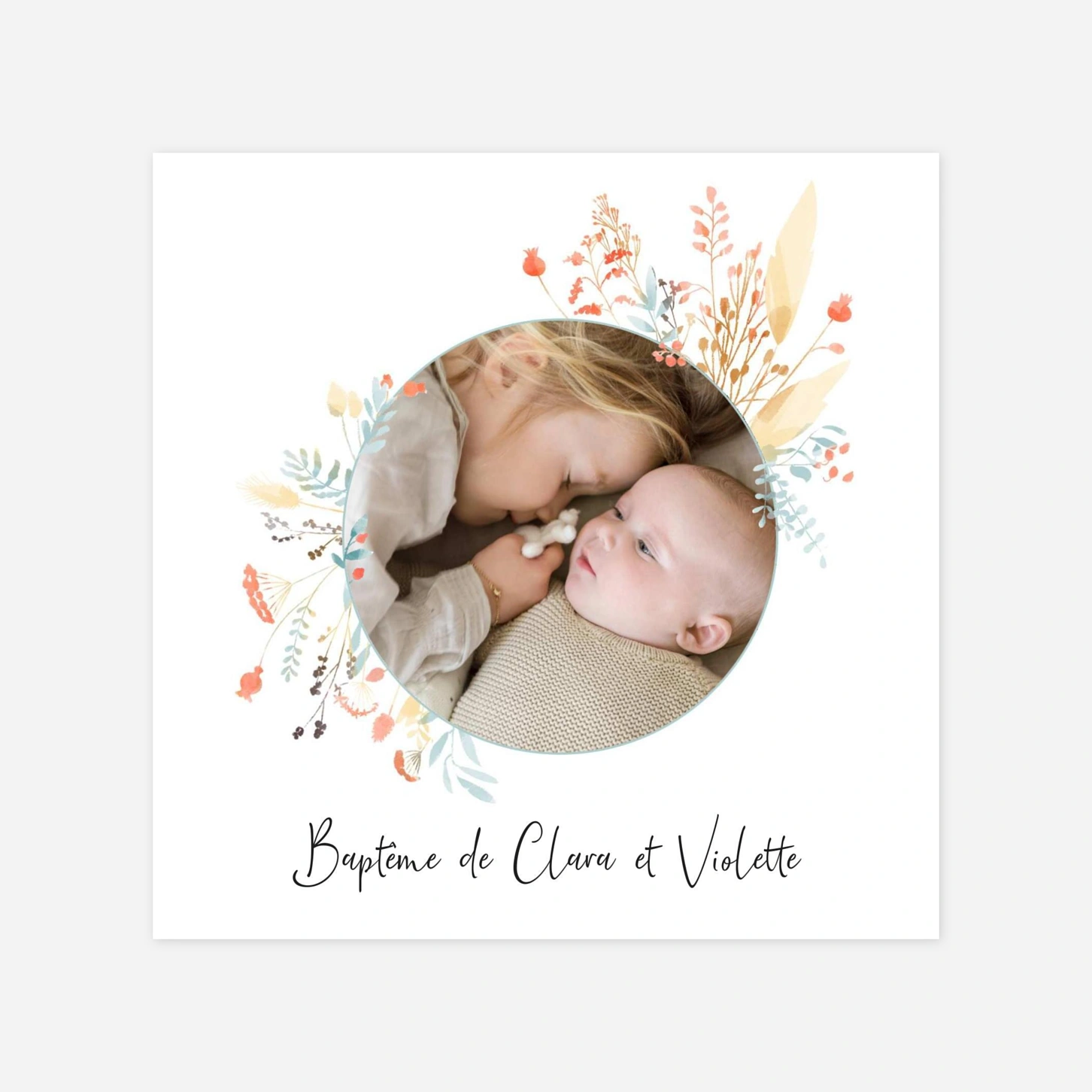 Voici une carte au design sobre et raffiné pour annoncer avec élégance l’événement. Le faire-part de baptême Solstice d'été I met à l’honneur la plus belle photo de vos enfants, délicatement entourée d’une couronne florale. Ce détail poétique apporte fraîcheur et tendresse à votre annonce. Personnalisez votre faire-part sur notre éditeur en ligne. Un service de retouche est inclus dans votre commande. Impression haut de gamme au cœur de notre atelier, sur de beaux papiers de création.