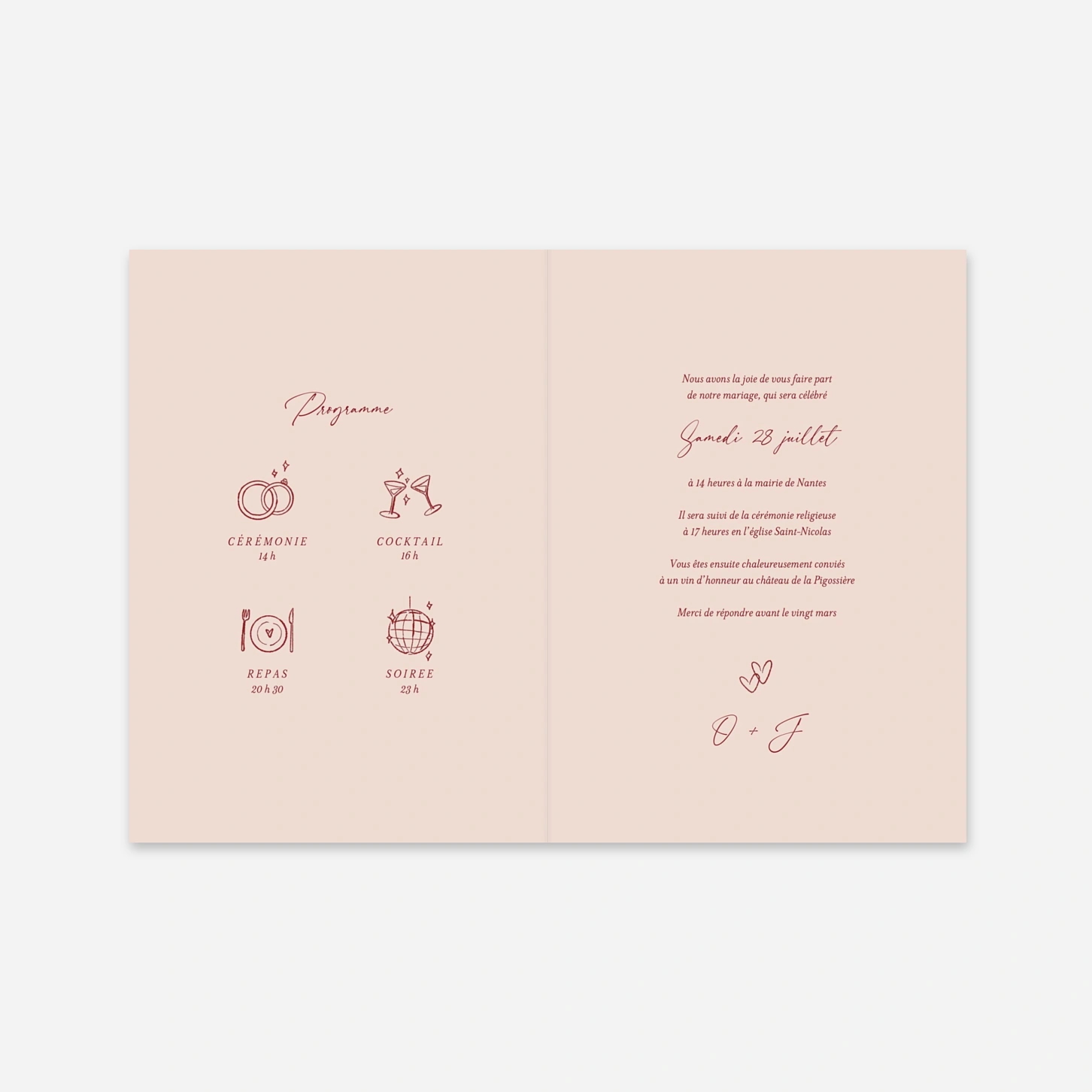 - Pages intérieures : 1 double-page pour les marié.e.s, 2 doubles-pages différentes pour les invités.