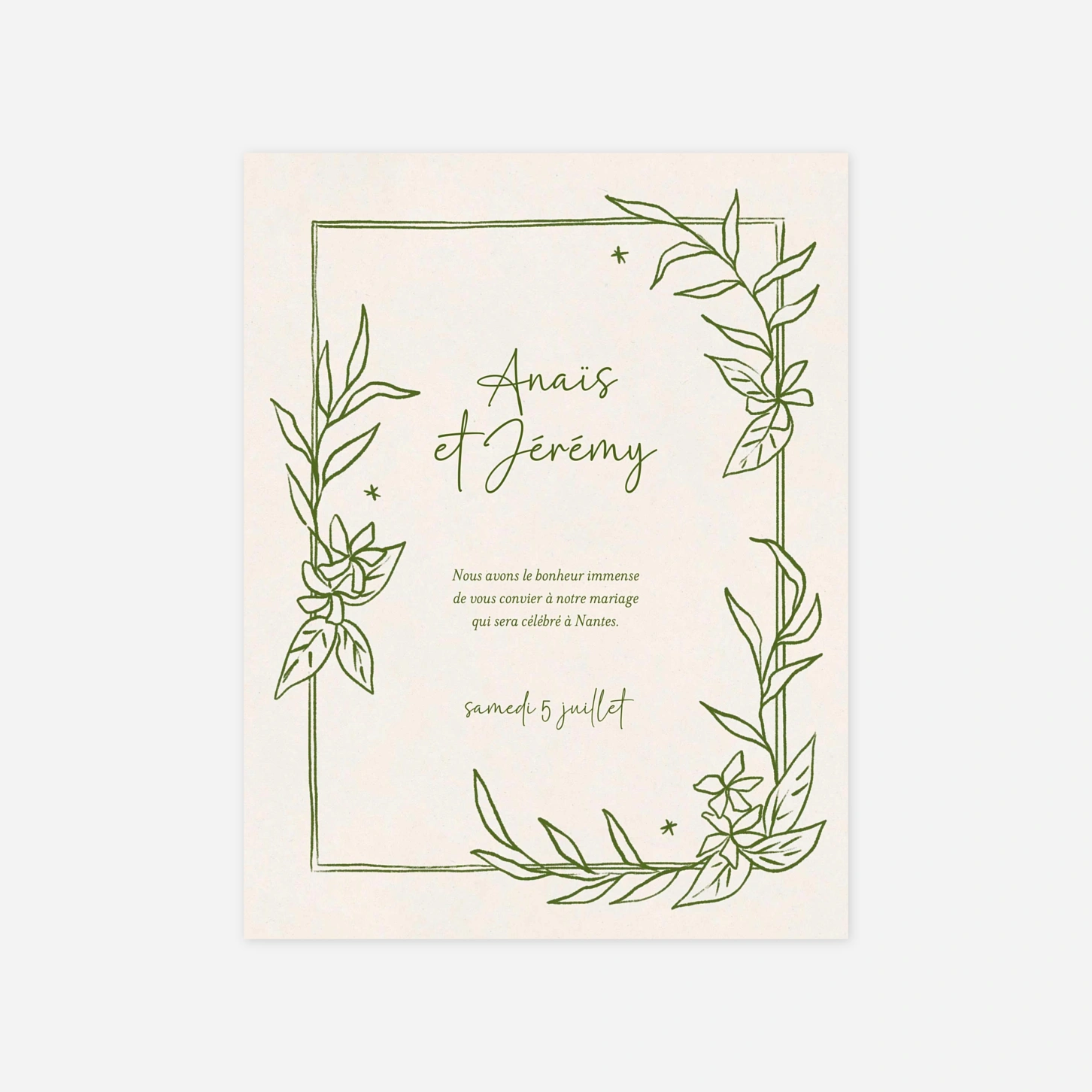 « Fogliame » séduit par son illustration délicate de branches et de feuillages, tracée comme à la main pour encadrer tendrement votre texte. La composition épurée met en valeur vos prénoms et la date de votre mariage, afin que l’essentiel reste au centre de l’attention. De petits détails graphiques apportent une note légère et joyeuse à l’ensemble. L’association d’un motif végétal intemporel et d’une typographie moderne confère à cette carte une élégance naturelle. C'est une invitation qui respire la douceur et annonce avec charme la plus belle des journées.