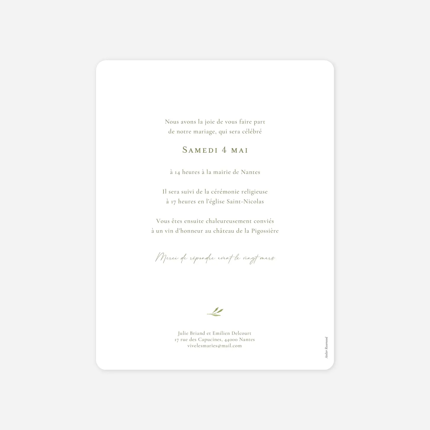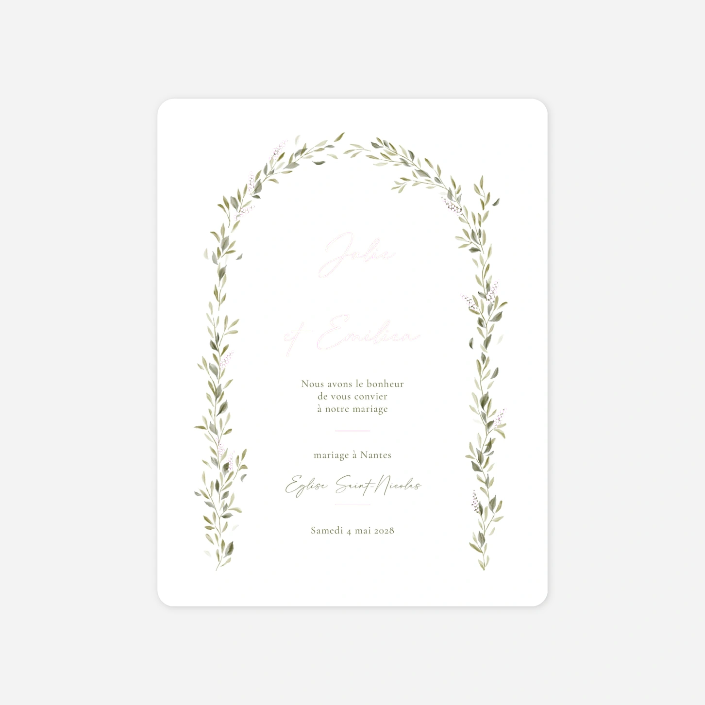 Sur le faire-part de mariage Instant botanique, un arche végétal décore avec finesse votre invitation, pour annoncer avec douceur et élégance votre union. 4 déclinaisons au choix : blanc, terracotta, vert ou effet kraft. Ce faire-part se personnalise au recto et au verso avec votre texte sur notre éditeur en ligne. Impression haut de gamme sur de beaux papiers de création.