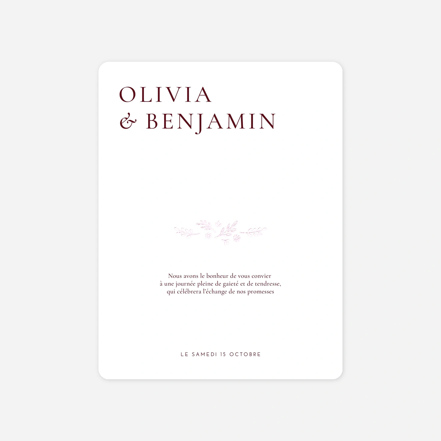 Minimaliste et élégant, le faire-part de mariage Laure de Sagazan II inspirera les futurs mariés qui imaginent une union classique et romantique. Décliné en différents coloris naturels et vintage, et illustré de feuillages délicats, il évoquera également une ambiance chic et bohème. Vos deux prénoms sont inscrits avec d’élégantes lettres capitales, ajoutant une touche graphique à ce modèle. Le verso laisse place à votre message d’annonce, inscrit sobrement sur un fond blanc. Impression haut de gamme sur de beaux papiers de création.