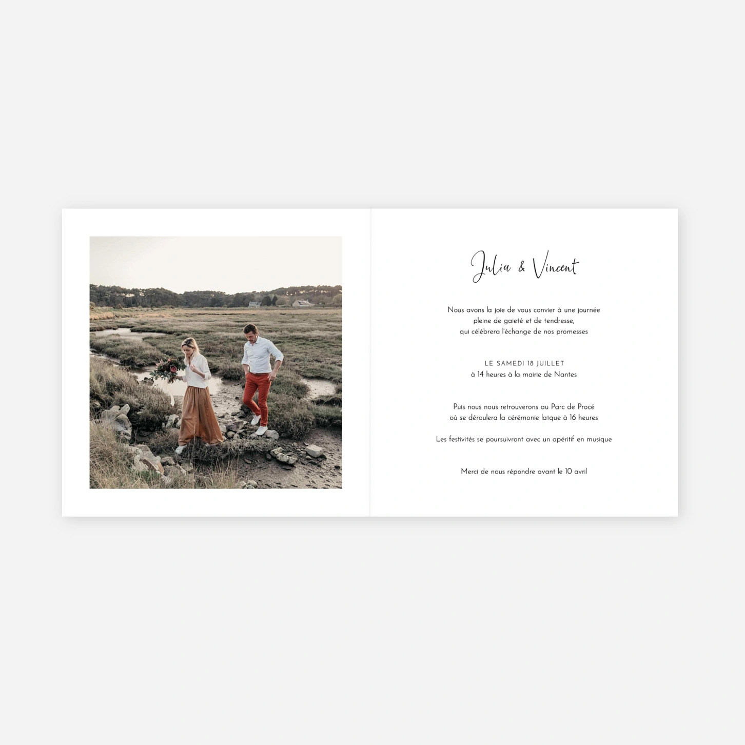Assis dans un délicat jardin fleuri, ces jolis mariés tendrement illustrés nous plongent dans une étreinte de nature et d'amour. Le faire-part de mariage "Les mariés champêtres (jardin)" crée une atmosphère intime et chaleureuse pour annoncer tout en douceur votre grand jour. Son format 4 pages laisse découvrir à l’intérieur une jolie photo de votre couple et votre message d’invitation inscrit sobrement. Les dessins des mariés sont disponibles en différentes déclinaisons pour représenter au mieux votre couple. Un service de retouche est inclus dans votre commande et vous assure un résultat optimal. Impression haut de gamme réalisée sur des papiers de création choisis avec soin.