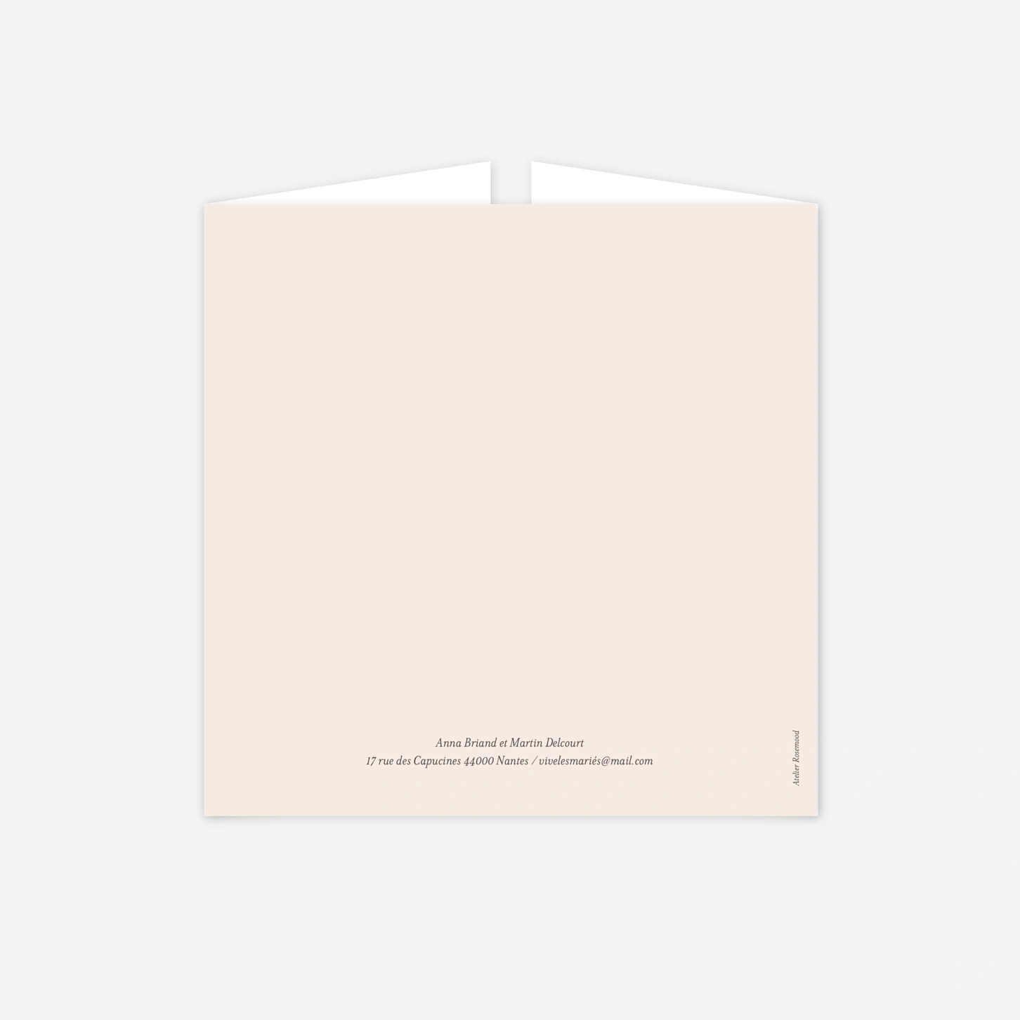 Associez praticité et élégance avec le faire-part de mariage “Lieu de noces”. Son design épuré dans des tons beige doux crée une atmosphère apaisante et met en valeur une délicate illustration de château, empreinte de charme romantique. Dans notre éditeur en ligne, vous pouvez personnaliser ce visuel selon vos envies – en le remplaçant par une illustration de votre lieu de réception ou une photo. Une manière unique de raconter votre histoire dès la première annonce. “Lieu de noces” est disponible en plusieurs formats et imprimé sur un papier de création haut de gamme, pour un rendu aussi raffiné que personnel