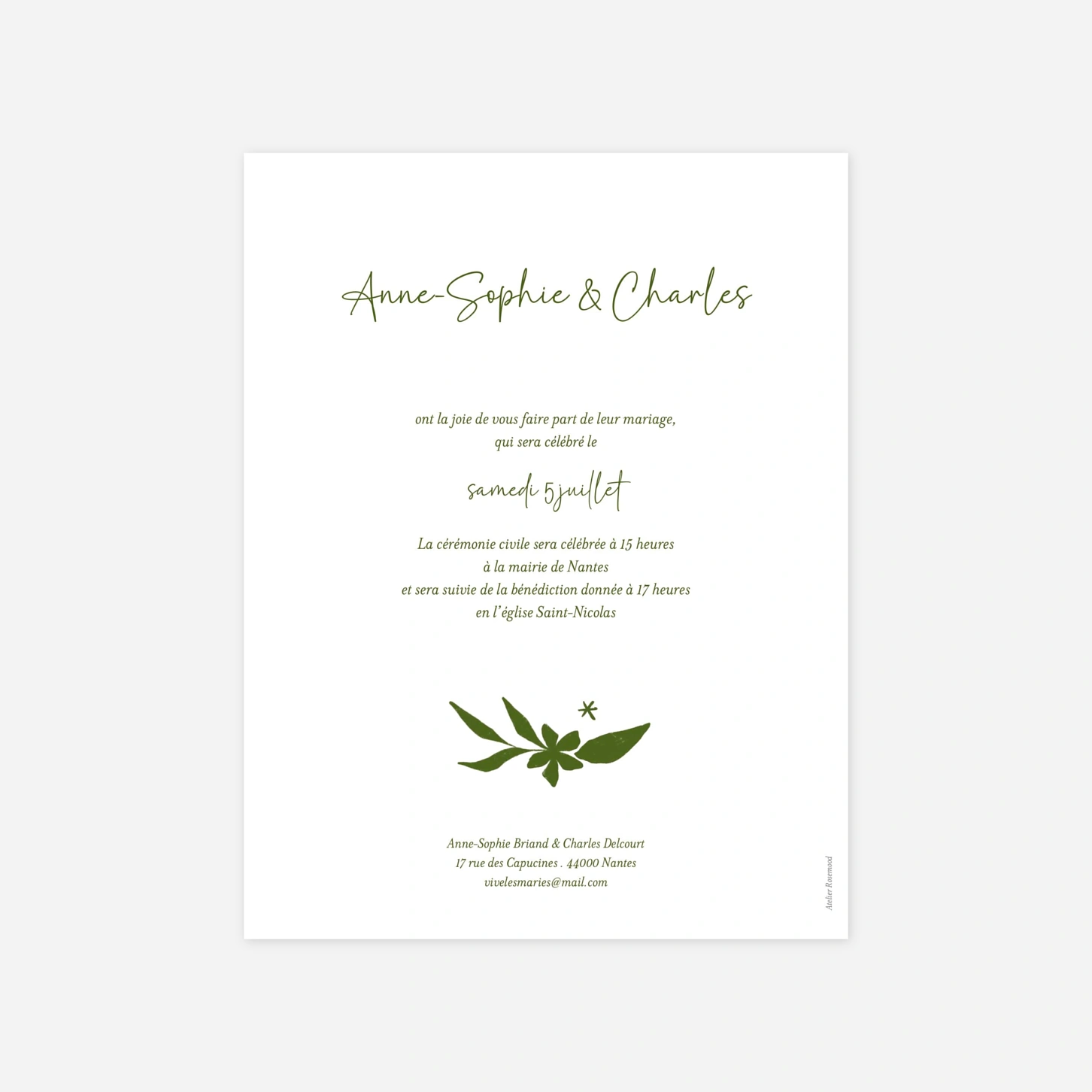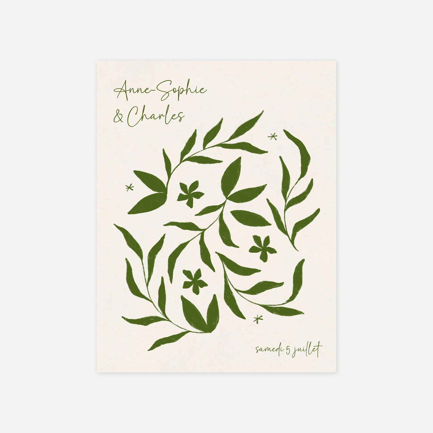 Le faire-part de mariage "Silvano" célèbre la nature avec une élégance douce et intemporelle. Ses motifs floraux délicatement stylisés évoquent la légèreté des beaux jours et la joie d’un amour qui s’épanouit. Conçu par nos designers et imprimé avec soin dans nos ateliers en France et en Allemagne, il séduit par son charme poétique et raffiné. Recevez un échantillon gratuit pour apprécier la qualité de nos papiers avant de créer votre modèle personnalisé.
