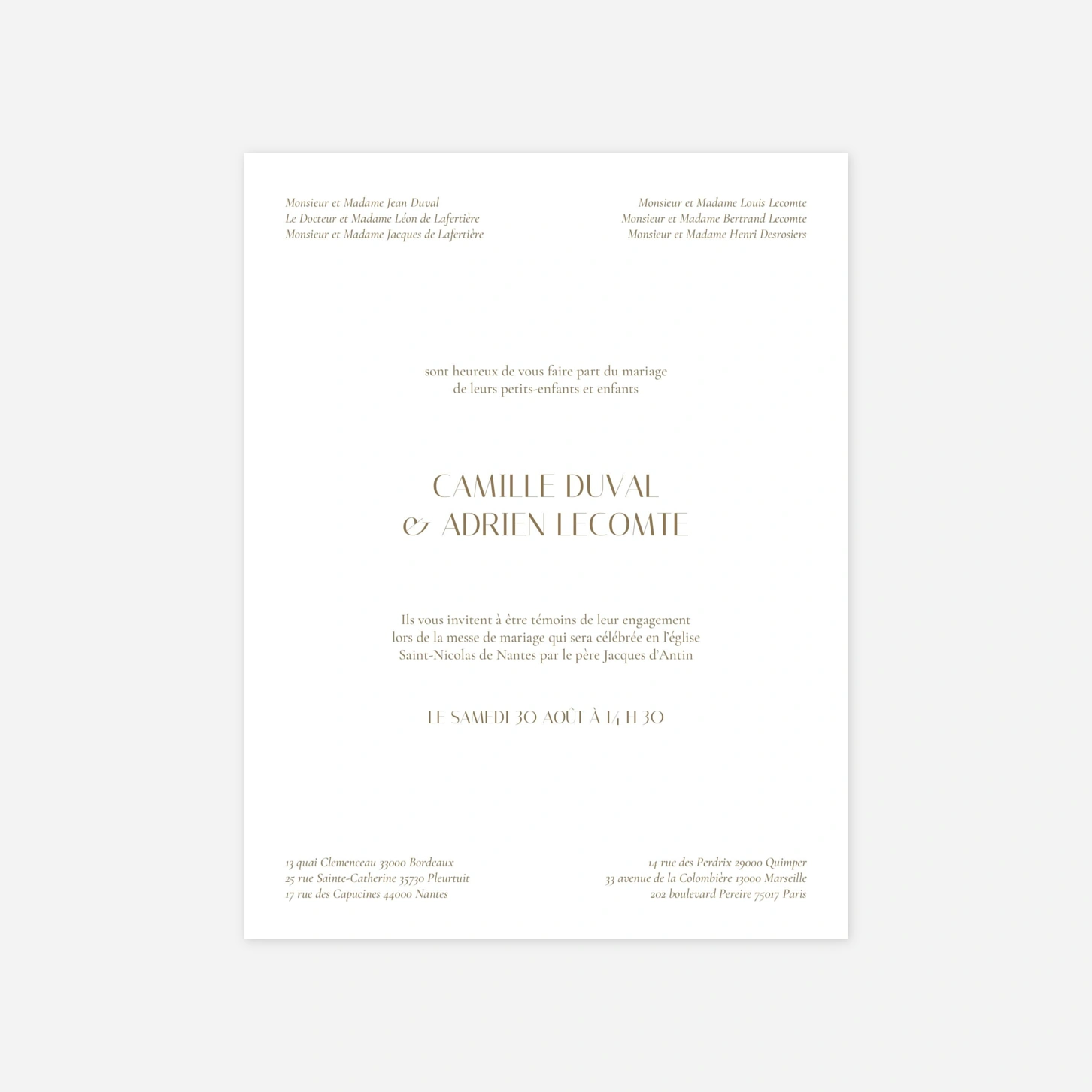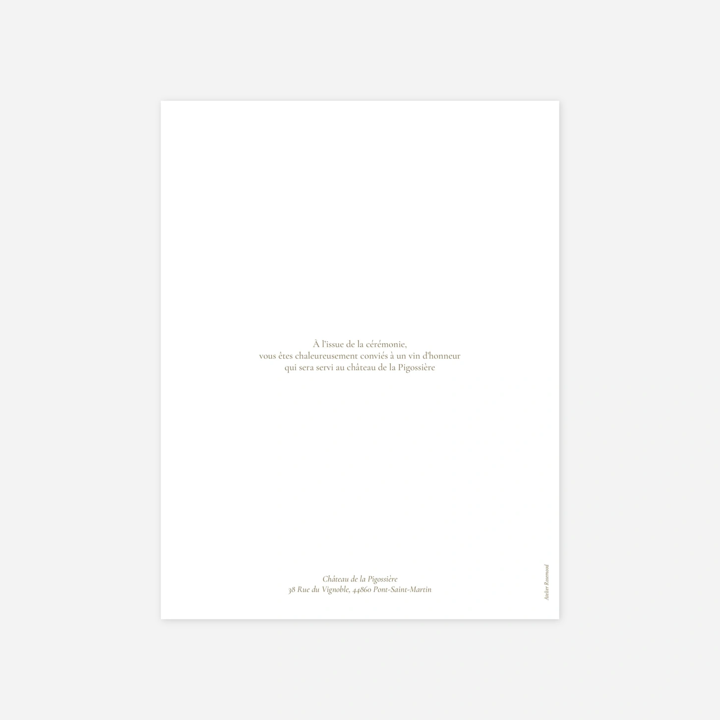 Le faire-part de mariage “Unis” est parfait pour annoncer vos festivités de manière classique et traditionnelle. Son design épuré, sans illustration, met la typographie en avant et célèbre la sobriété avec élégance. Cette carte respecte les usages traditionnels du mariage, notamment l’annonce faite au nom des parents ou grands-parents des mariés. Imprimée sur un papier de création haut de gamme, le faire-part “Unis” se personnalise facilement et entièrement en ligne grâce à notre éditeur. Un faire-part intemporel, discret et raffiné, qui saura marquer les esprits.