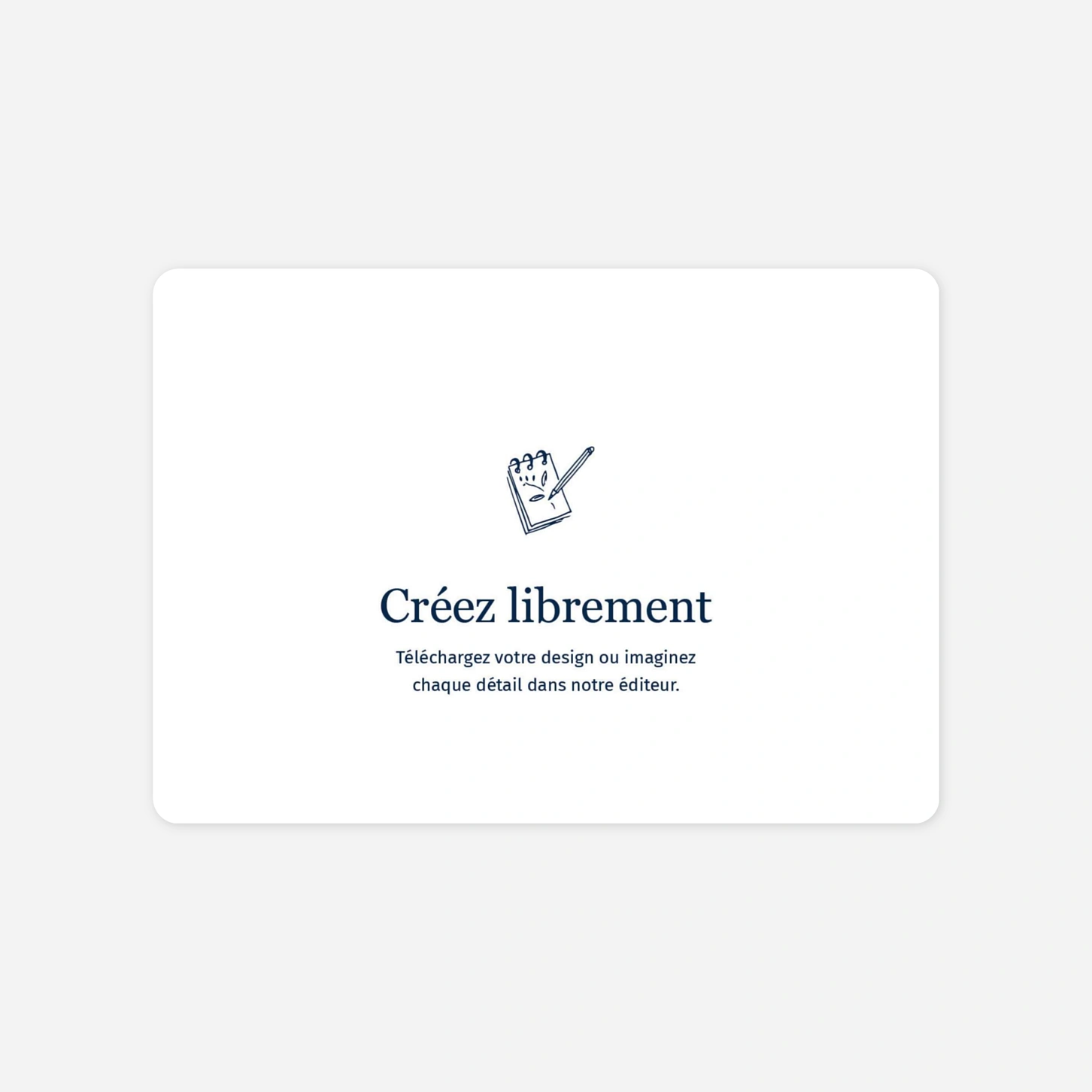 Le faire-part de naissance « 100% Personnalisable » vous offre une liberté totale pour créer une annonce qui vous ressemble vraiment. Vous pouvez y ajouter vos photos, vos mots et chaque détail qui racontera avec douceur l’arrivée de votre enfant, comme sur un véritable faire-part de naissance personnalisé. Grâce à notre éditeur intuitif et à l’impression réalisée dans nos propres ateliers en France et en Allemagne, votre création prendra vie avec une qualité irréprochable. Profitez également de nos échantillons gratuits pour découvrir le rendu avant de valider votre commande. Personnalisez votre modèle dès maintenant.