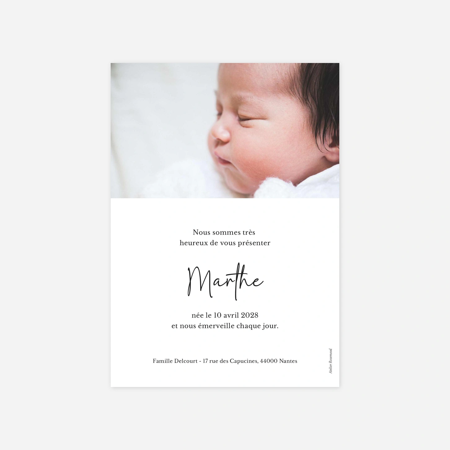 Le faire-part de naissance Beaux pictogrammes célèbre avec tendresse l’arrivée de votre bébé à travers une mise en page douce et épurée. Les jolis pictogrammes illustrent avec poésie les premiers détails de votre enfant, pour un souvenir aussi précieux qu’intemporel. Imprimé sur nos papiers premium dans nos propres ateliers en France et en Allemagne, il allie émotion et savoir-faire artisanal. Profitez d’un échantillon gratuit pour découvrir la qualité de nos faire-part de naissance personnalisés.