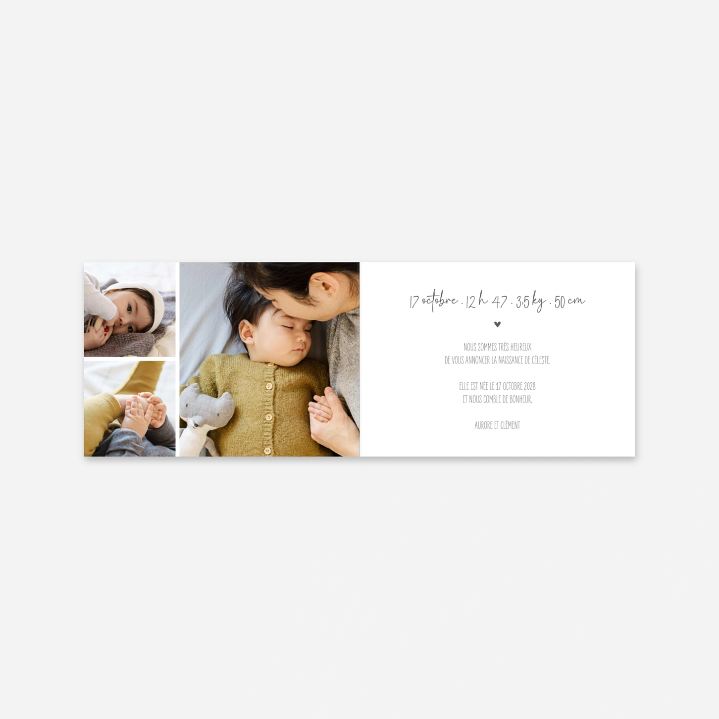 Le faire-part de naissance « Bonne étoile » annonce l’arrivée de votre enfant avec une douceur lumineuse et pleine de spontanéité. Pensé pour laisser toute sa place à vos plus beaux souvenirs, ce faire-part de naissance personnalisé se configure facilement en ligne avec votre texte et vos photos. Imprimé avec soin dans nos propres ateliers en France et en Allemagne, il révèle toute la précision de notre impression et l’exigence de nos papiers premium. Vous pouvez également commander un échantillon gratuit pour apprécier le rendu avant l’envoi. Personnalisez votre faire-part et partagez cette jolie nouvelle avec ceux qui comptent.