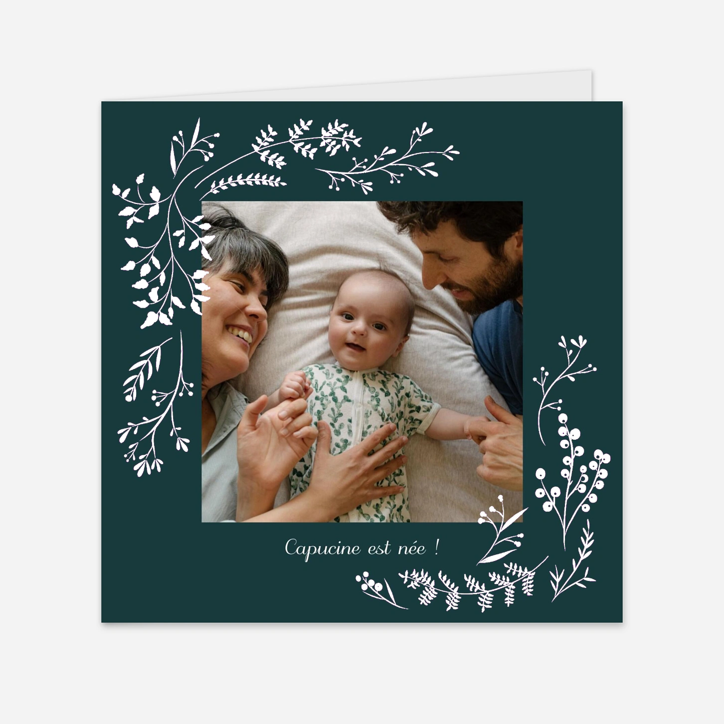 Enchantez vos proches avec le faire-part de naissance Brins d’hiver, orné de feuillets délicats autour de la photo de bébé et d'un aplat de couleur profond. Ce modèle vous permet de personnaliser en ligne les 4 pages avec vos textes et vos photos, tout en offrant 4 déclinaisons au choix : bleu, vert, rouge ou kraft. Partagez votre message d'annonce sobrement et faites de ce moment un souvenir inoubliable. Découvrez également notre collection pour d'autres inspirations.