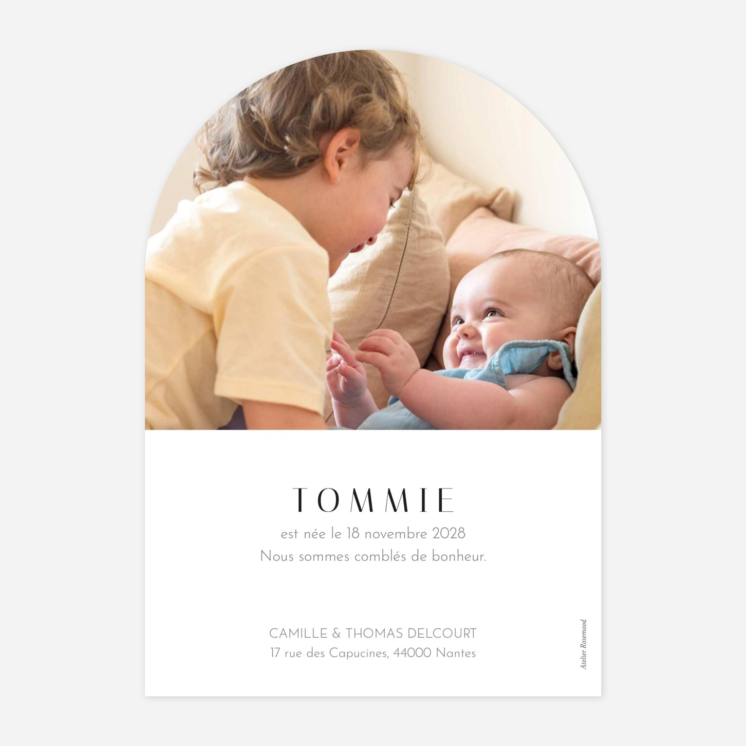 Le faire-part de naissance Coeur d’or est une annonce élégante et moderne qui met en valeur votre plus belle photo. Son design graphique et épuré, rehaussé d'un délicat cœur doré, apporte une touche de raffinement à votre message. Le prénom de votre enfant est inscrit dans une typographie contemporaine, suivi de sa date de naissance. À l'intérieur, vous pouvez partager une seconde photo et personnaliser votre texte selon vos envies grâce à notre éditeur en ligne. Une fois votre création finalisée, notre service de retouche vous assure un rendu parfait pour l'impression.