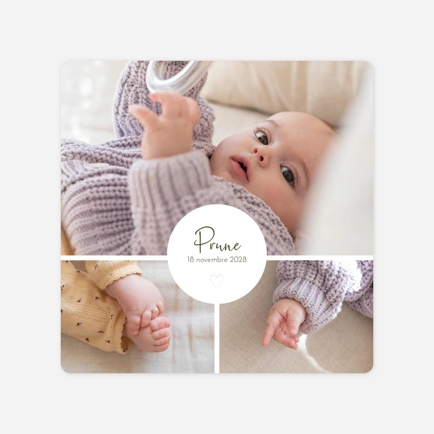 Annoncez l’heureuse nouvelle en partageant vos plus belles photos avec le faire-part de naissance Cœur médaillon. Ce modèle se compose d’une mise en page multiphotos sublimée par un joli cœur, soulignant avec finesse le prénom de votre enfant et sa date de naissance. Le verso accueille une quatrième photo, suivie de votre message d’annonce et d’un autre petit cœur. Vous pourrez également mentionner vos coordonnées ou le texte de votre choix. Deux coloris sont disponibles pour le texte et le motif : vert et orange. Personnalisez votre faire-part à l’aide de notre éditeur en ligne et laissez libre cours à votre créativité.