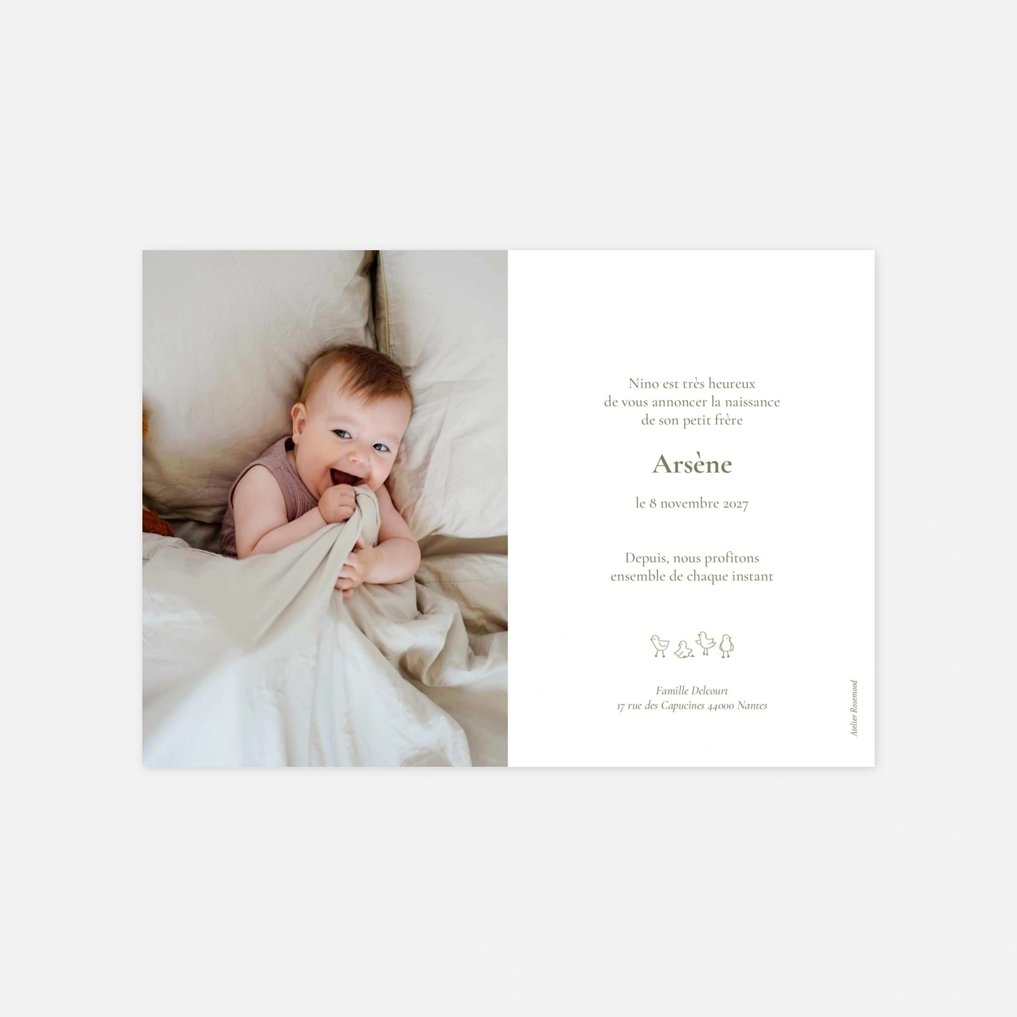 Le faire-part de naissance « Douce biche » s’orne de délicates illustrations inspirées de la nature. De fins dessins au trait représentent une biche paisible, des oiseaux, un écureuil ou encore un hérisson, entourés de fleurs, de feuillages et de grands arbres. L’ensemble crée un décor poétique et champêtre, comme une balade dans les bois. Cette atmosphère douce et raffinée met en valeur avec tendresse la photo de votre bébé.