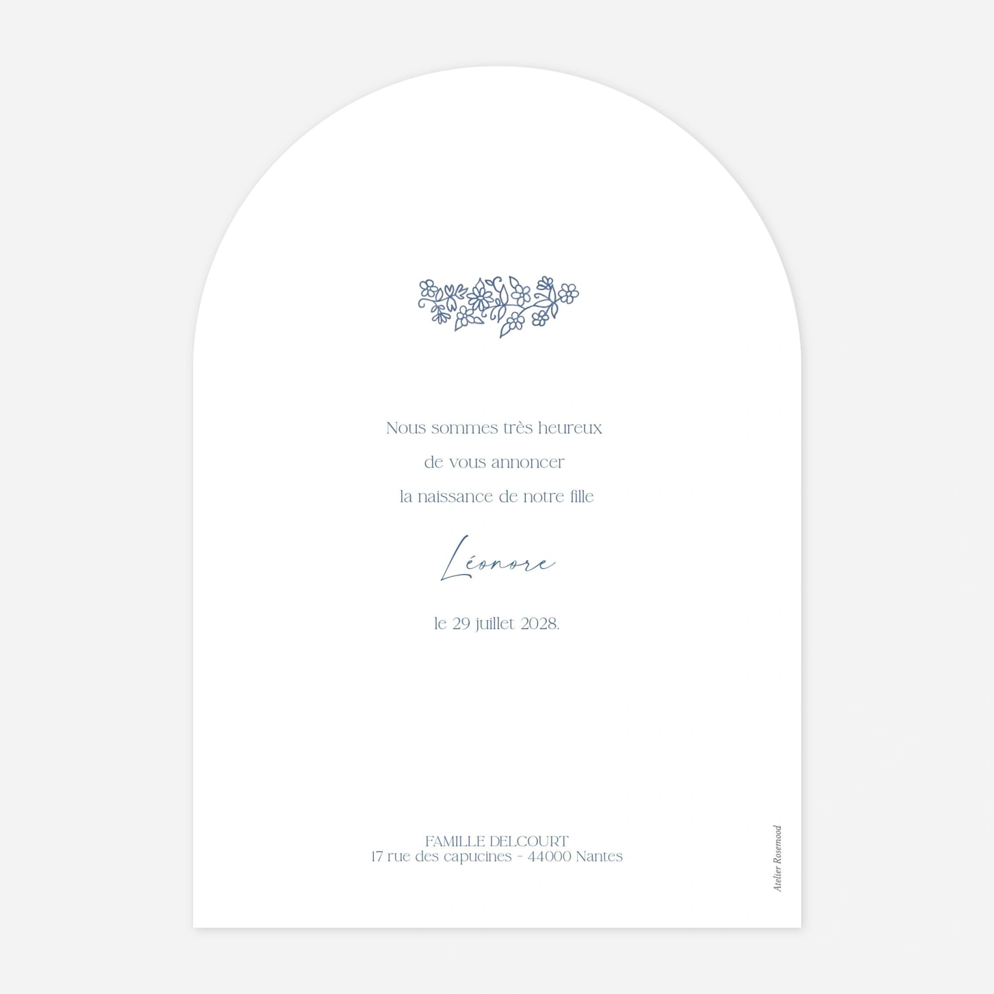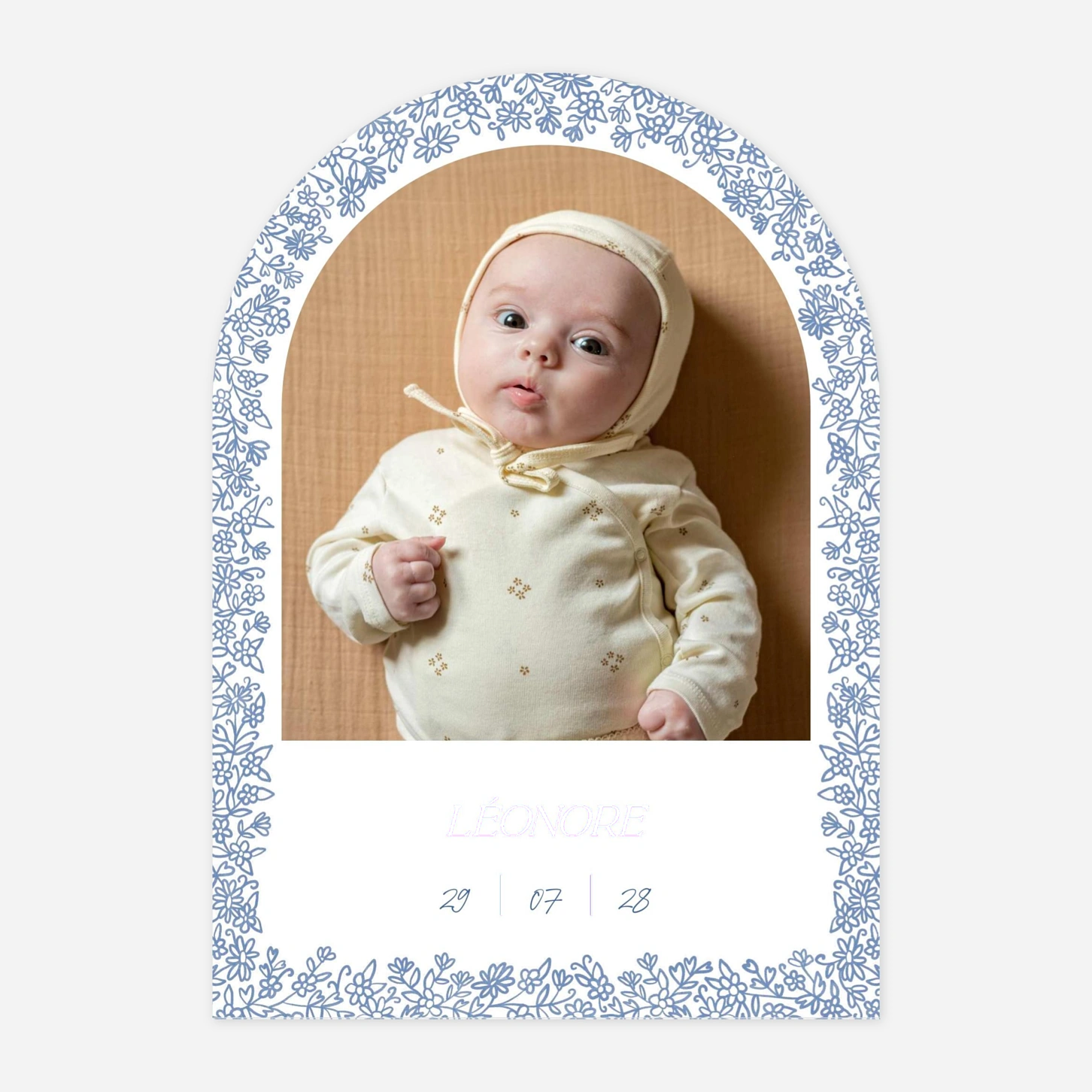 Le faire-part de naissance « Élegance florale » célèbre l'arrivée de votre nouveau-né dans un écrin de douceur et de poésie. Ce modèle se distingue par son illustration délicate de fleurs champêtres qui encadre avec tendresse la photo de votre choix. Pour vous assurer d'un rendu parfait, nous vous offrons un échantillon gratuit afin de découvrir la qualité exceptionnelle de nos papiers de création. Toutes nos collections sont conçues avec amour au sein de notre atelier et imprimées grâce à notre savoir-faire haute précision. Personnalisez ce faire-part de naissance élégant en quelques clics pour partager votre bonheur avec vos proches.
