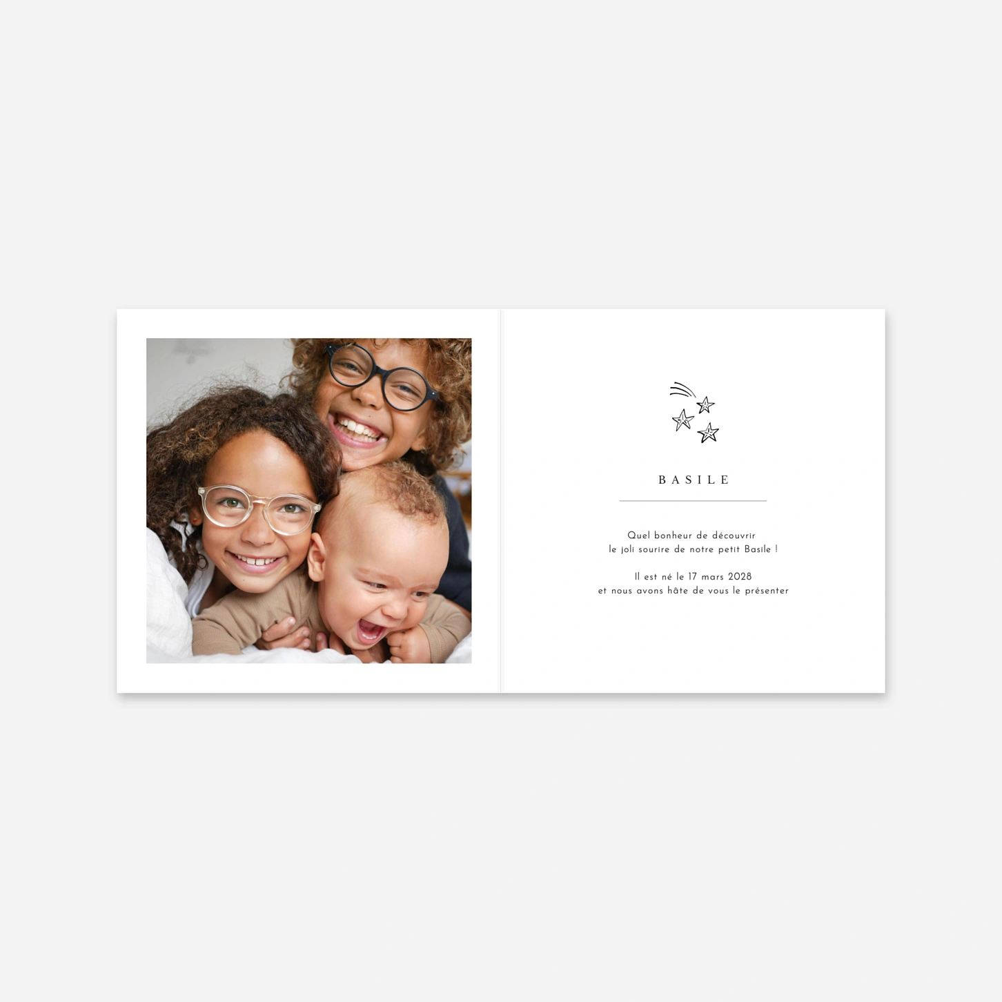 Voici le faire-part de naissance Étiquette illustrée (4 pages), un modèle au design sobre et épuré pour annoncer l’arrivée de bébé tout en légereté. Nous adorons ses douces couleurs pastel, ses typographies délicates et ses jolis motifs tendrement dessinés par la talentueuse Tomoë, que vous pourrez choisir parmi une bibliothèque complète d’illustrations. Ce faire-part se décline en quatre coloris, choisissez celui qui vous plaît le plus et personnalisez ensuite les quatre pages de votre modèle avec notre outil d’édition. Ajoutez vos photos, vos textes, puis jouez avec nos différentes polices d’écriture pour en faire une création à votre image.