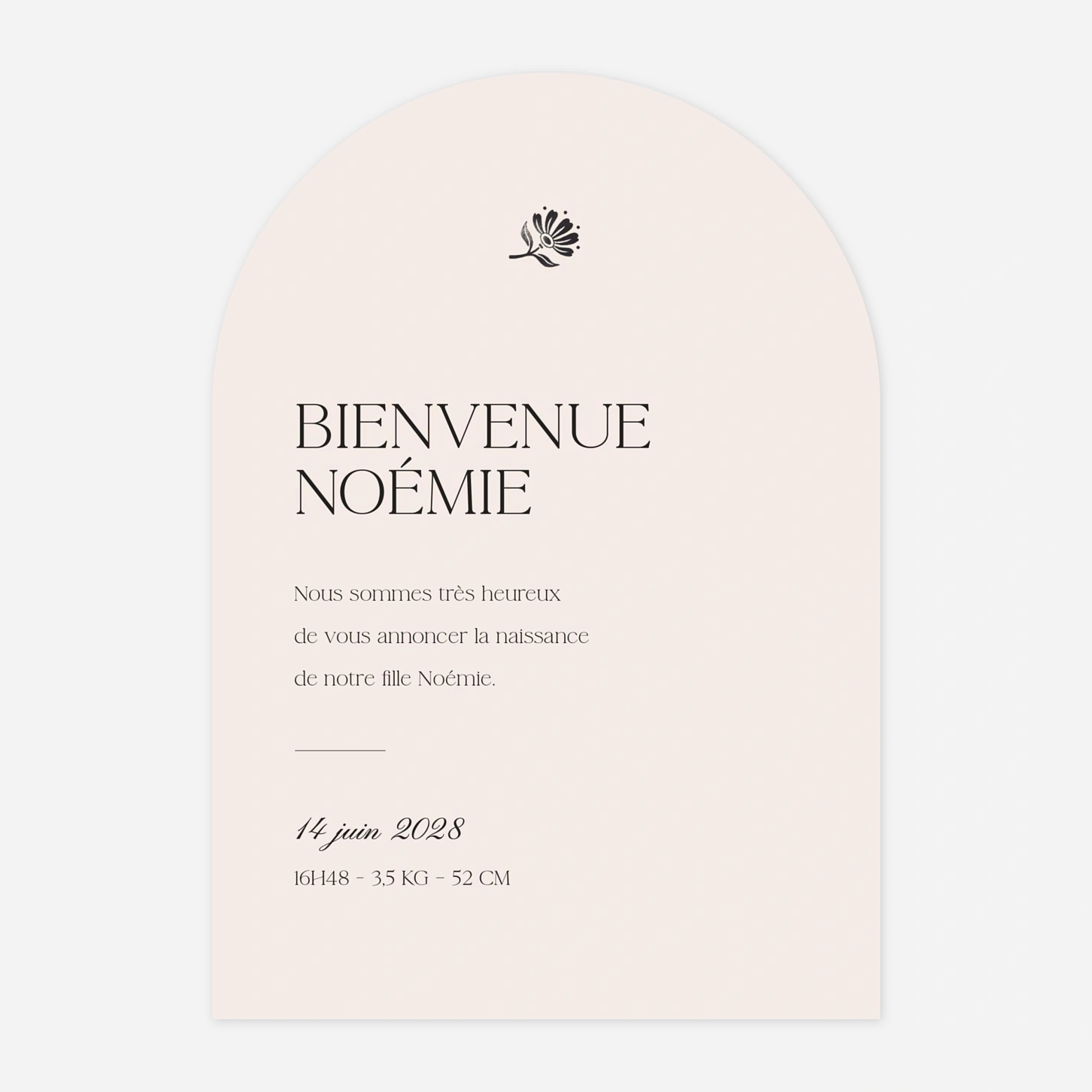 Le faire-part de baptême « Fleur minimale » séduit par son design épuré et sa découpe en arche très tendance, idéale pour une annonce pleine de modernité. Ornée d'une délicate illustration florale, cette invitation de baptême personnalisée mise sur une typographie élégante pour mettre en valeur les détails de cette journée précieuse. Nos créations sont imaginées avec passion dans notre studio et imprimées avec soin dans nos propres ateliers de production en France et en Allemagne. Utilisez notre outil d'édition pour configurer facilement vos textes et créer un modèle qui vous ressemble.