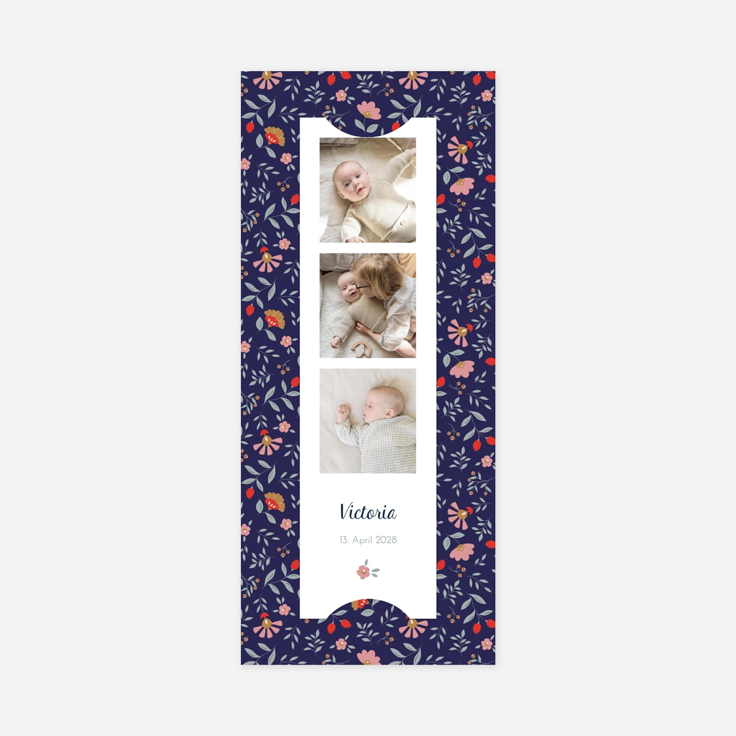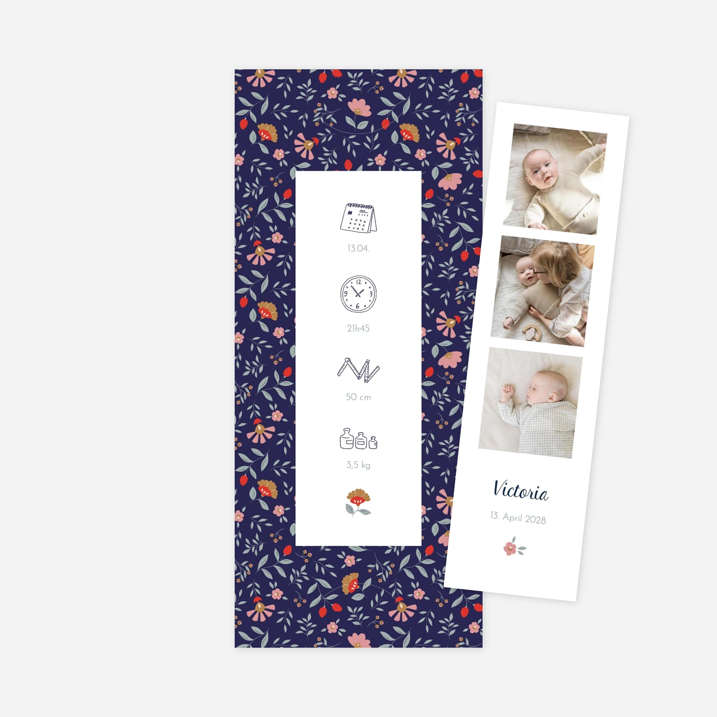 Une annonce graphique et florissante avec le faire-part de naissance Flora et son inspiration liberty. Son format marque-page permettra à vos proches de conserver un photomaton de 3 clichés votre nouveau-né, qu’ils pourront épingler au mur ou glisser dans leurs lectures ! En le détachant, il laissera découvrir de jolis pictogrammes pour symboliser chaque information clé de sa naissance. Le dos du faire-part accueillera une quatrième photo suivie de votre message d’annonce.