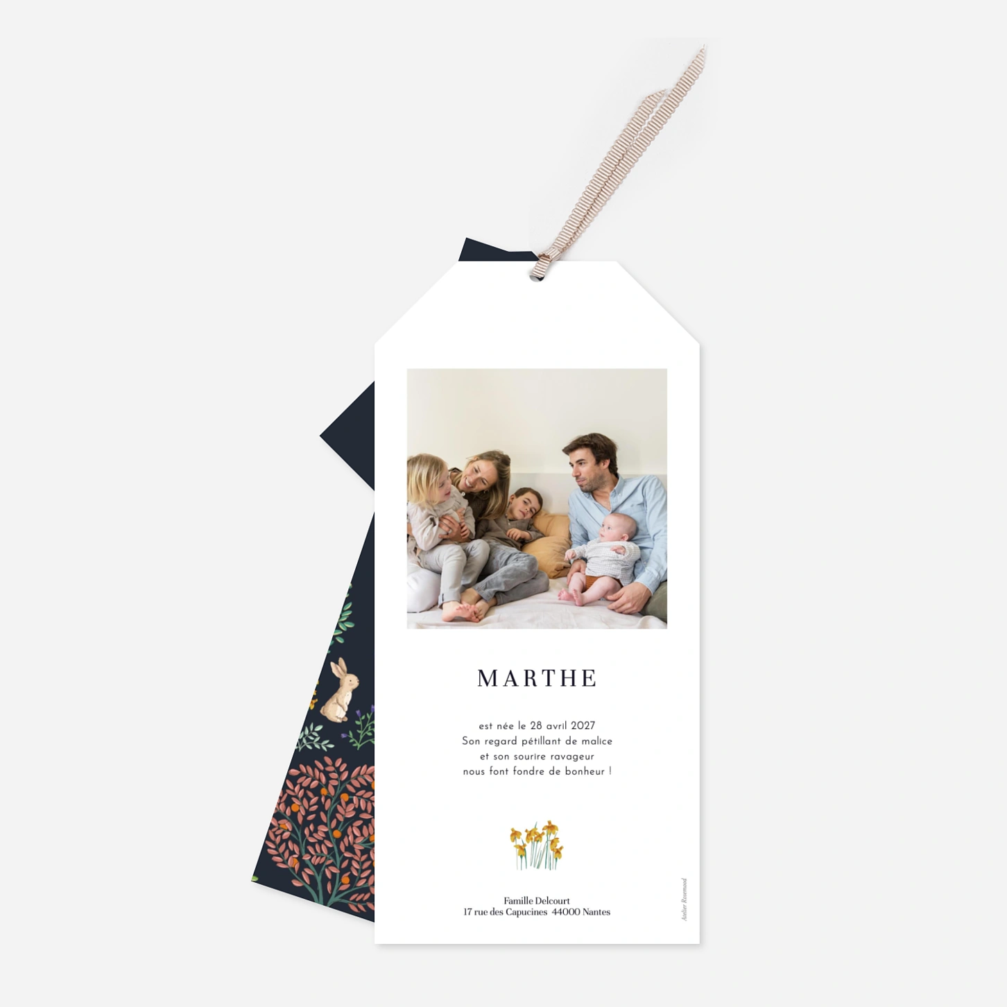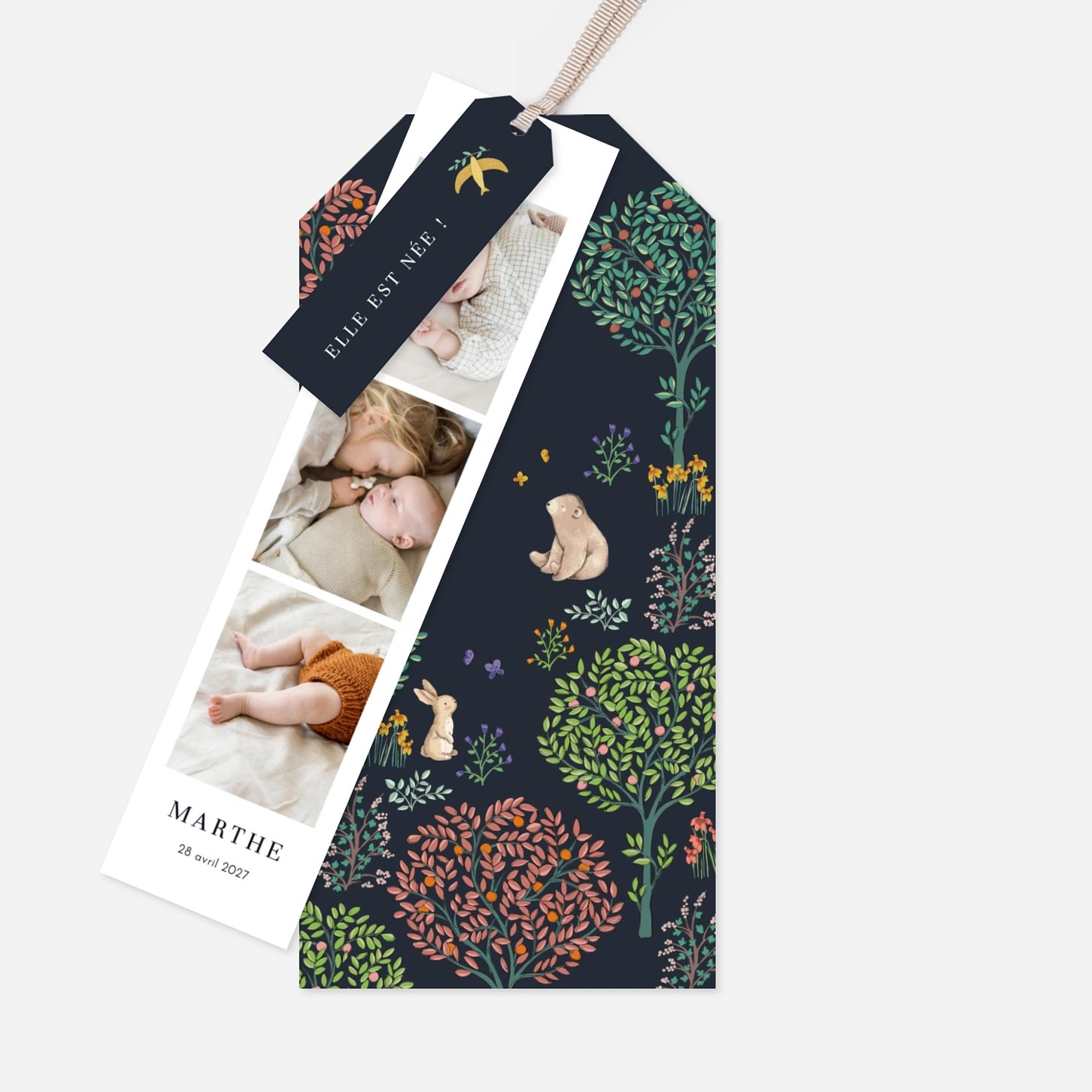 Les arbres fruitiers sont en fleurs, les papillons joueurs et ce tendre lapin et cet ours rêveurs… laissez-vous charmer par ce jardin enchanté pour annoncer avec douceur et poésie l’heureuse nouvelle. Le faire-part de naissance Histoire du jardin évoque une atmosphère poétique et florissante, idéale pour une annonce printanière. Service de retouche inclus et impression haut de gamme sur de beaux papiers de création.
