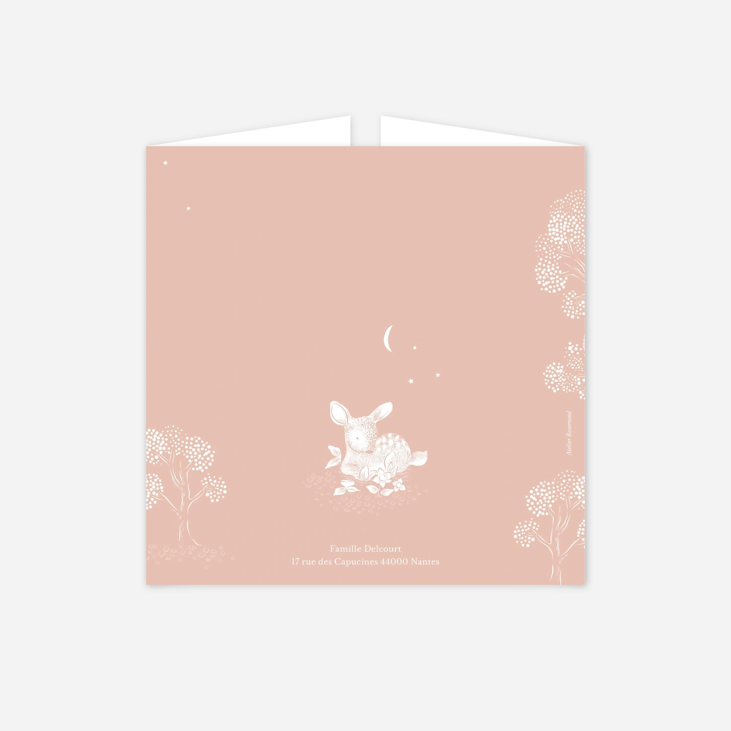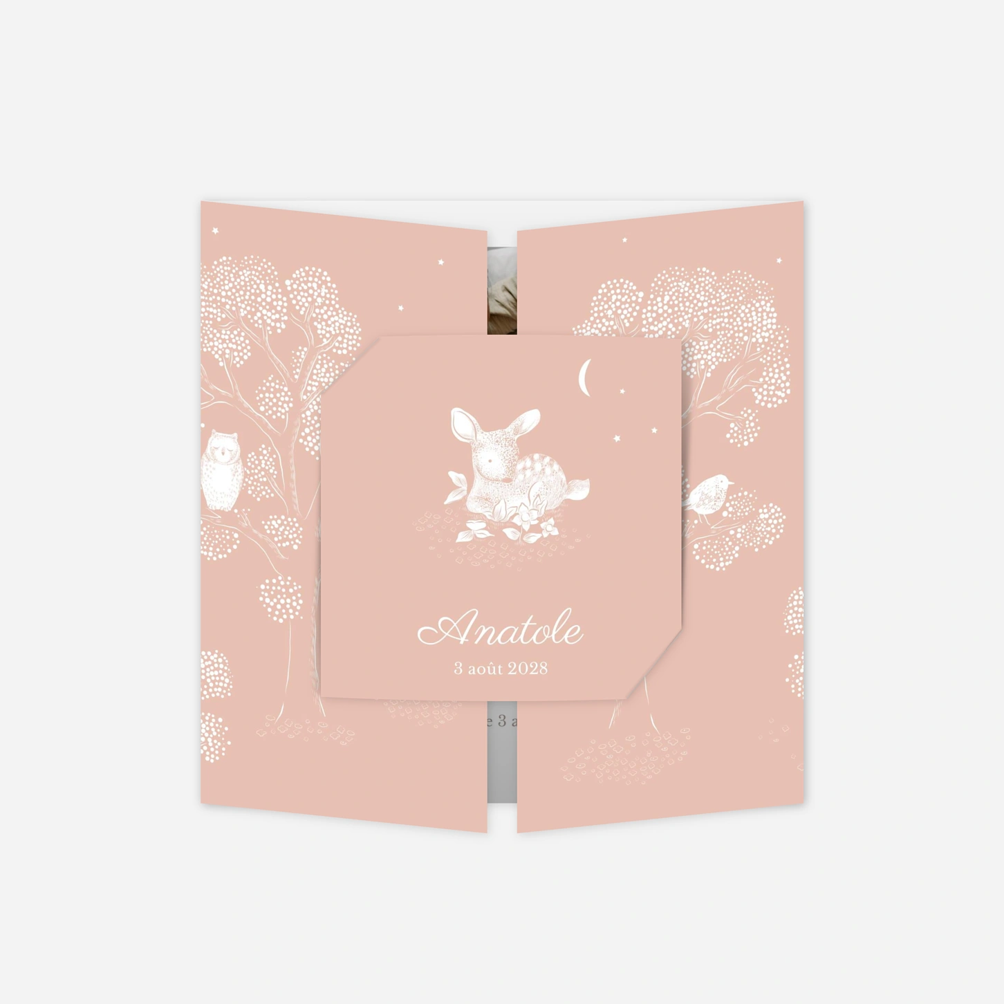 Laissez-vous charmer par le faire-part de naissance Histoire du soir, une création poétique illustrée par Mr & Mrs Clynk. Dans une forêt étoilée, des animaux attendrissants racontent la plus belle des histoires : la vôtre ! Disponible en trois coloris délicats – rose pastel, vert et bleu nuit – ce modèle vous permet de personnaliser votre texte et vos photos sur notre éditeur en ligne. Vos proches découvriront un petit tirage photo à l'intérieur, un souvenir précieux à conserver. N'hésitez pas à contacter notre service client pour toute question sur votre commande.