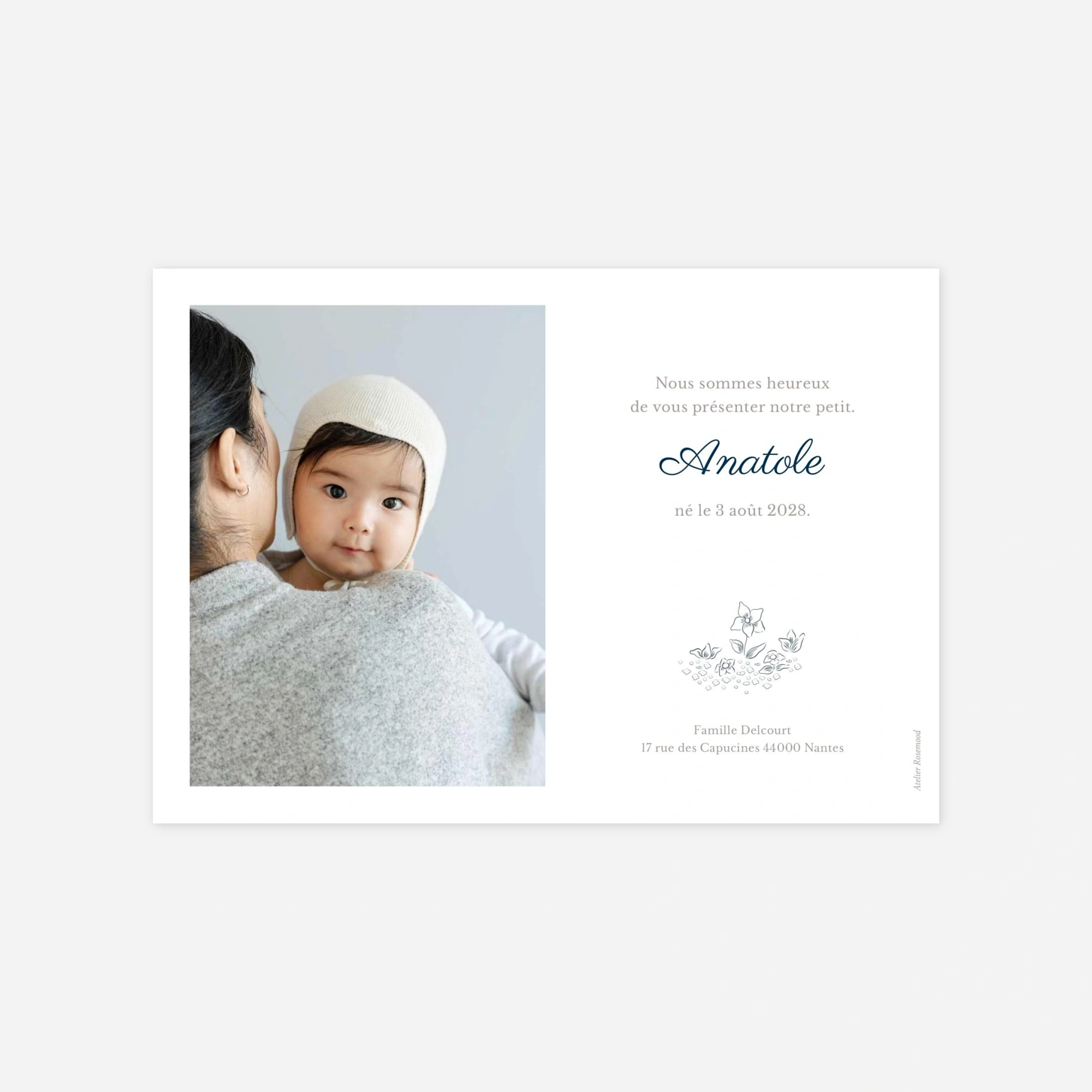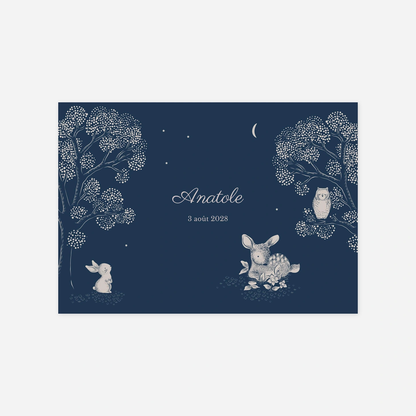 Laissez-vous charmer par le faire-part de naissance Histoire du soir, une création poétique illustrée par Mr & Mrs Clynk. Dans une forêt étoilée, des animaux attendrissants racontent la plus belle des histoires : la vôtre ! Disponible en trois coloris délicats – rose pastel, vert et bleu nuit – ce modèle vous permet de personnaliser votre texte et vos photos sur notre éditeur en ligne. Vos proches découvriront un petit tirage photo à l'intérieur, un souvenir précieux à conserver. N'hésitez pas à contacter notre service client pour toute question sur votre commande.