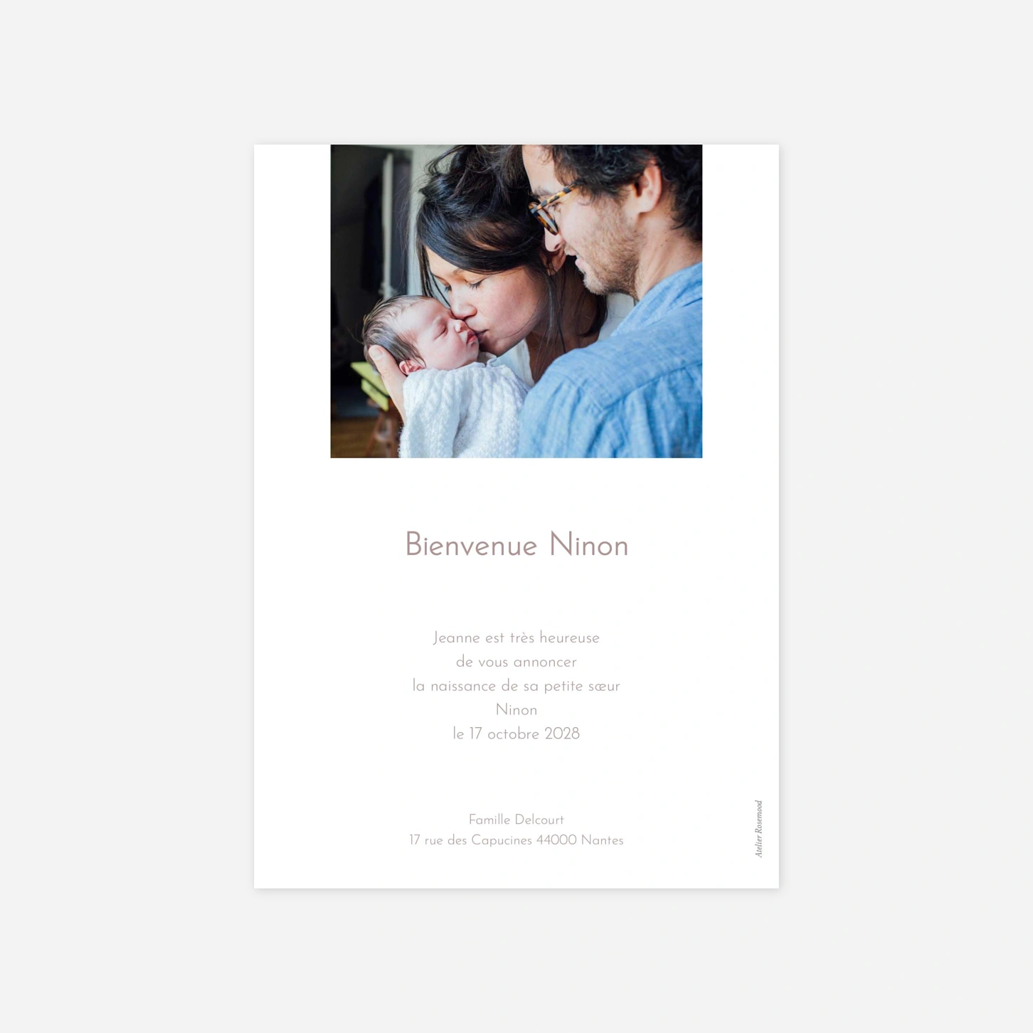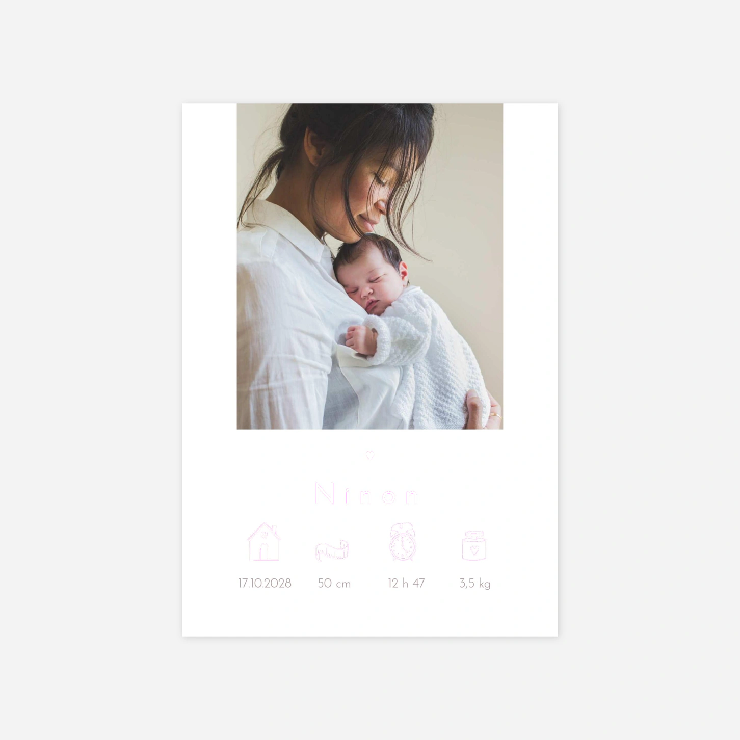 Le faire-part de naissance « Joie nouvelle » capture l'émotion pure de vos premiers instants avec bébé grâce à une mise en page épurée et moderne. Ce modèle met à l'honneur votre plus beau cliché, accompagné de délicats pictogrammes illustrant les détails précieux de cette rencontre inoubliable. Nos créations sont imaginées en interne et imprimées avec le plus grand soin dans nos propres ateliers pour vous garantir une qualité exceptionnelle. Pour vous accompagner dans ce moment unique, nous vous offrons la possibilité de commander un échantillon gratuit afin de découvrir le rendu de votre personnalisation. Personnalisez votre annonce en ligne en quelques clics pour partager votre bonheur avec vos proches.