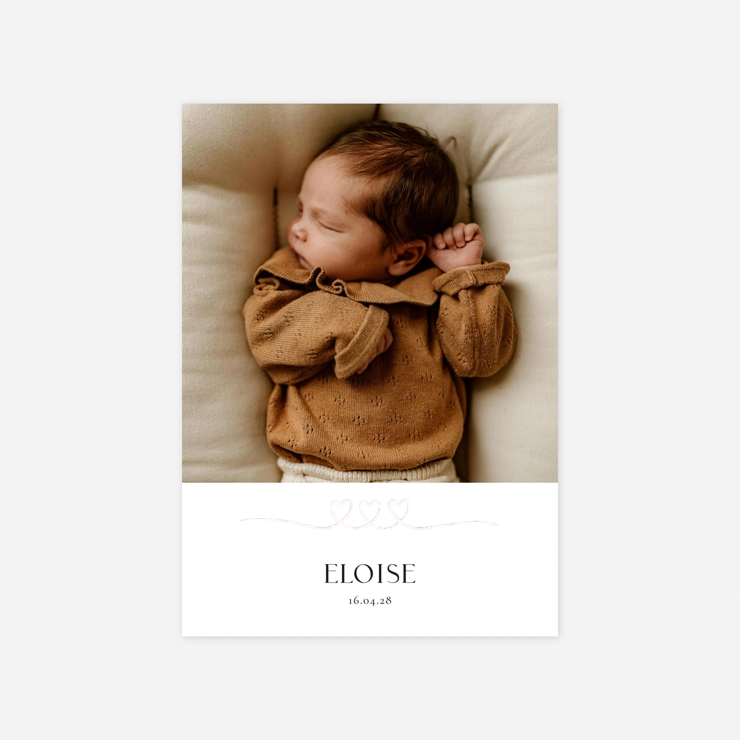 Pour célébrer la naissance de notre précieux enfant, nous vous présentons "Liens du cœur". Ce faire-part, orné de délicates dorures, symbolise les liens éternels qui unissent notre famille. Les doux motifs et la finition élégante rappellent que les plus beaux moments de la vie sont faits d'or et de tendresse. Une invitation à partager avec nous ce moment unique et précieux.