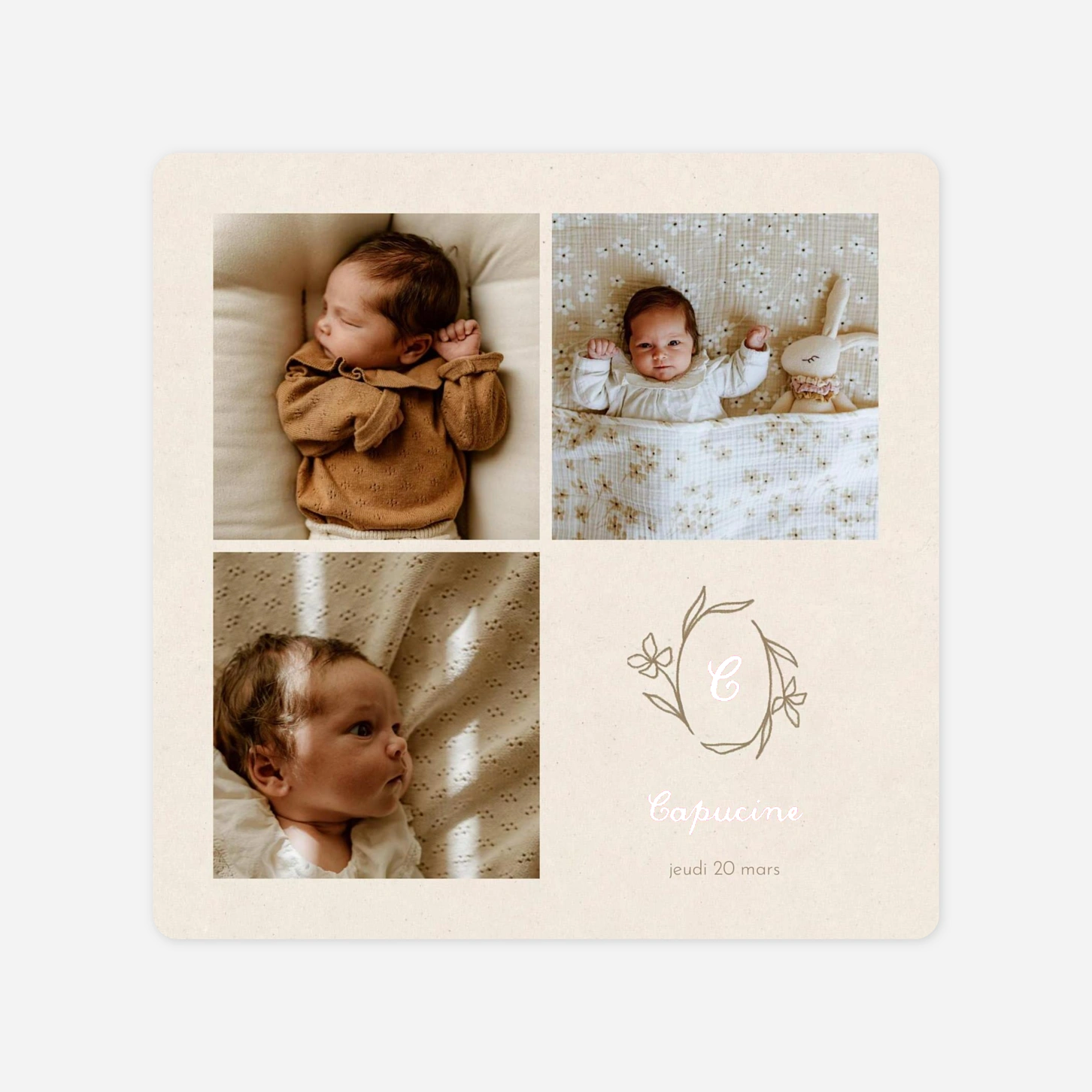 Le faire-part de naissance « Médaillon fleuri » célèbre avec poésie l’arrivée de votre enfant. Son motif délicat encadre avec douceur le prénom de votre bébé, tandis que vos plus belles photos viennent illuminer l’ensemble. Conçu par nos graphistes et imprimé avec soin dans nos ateliers en France et en Allemagne, il allie élégance et authenticité. Recevez gratuitement un échantillon pour apprécier la qualité de nos papiers et finitions.